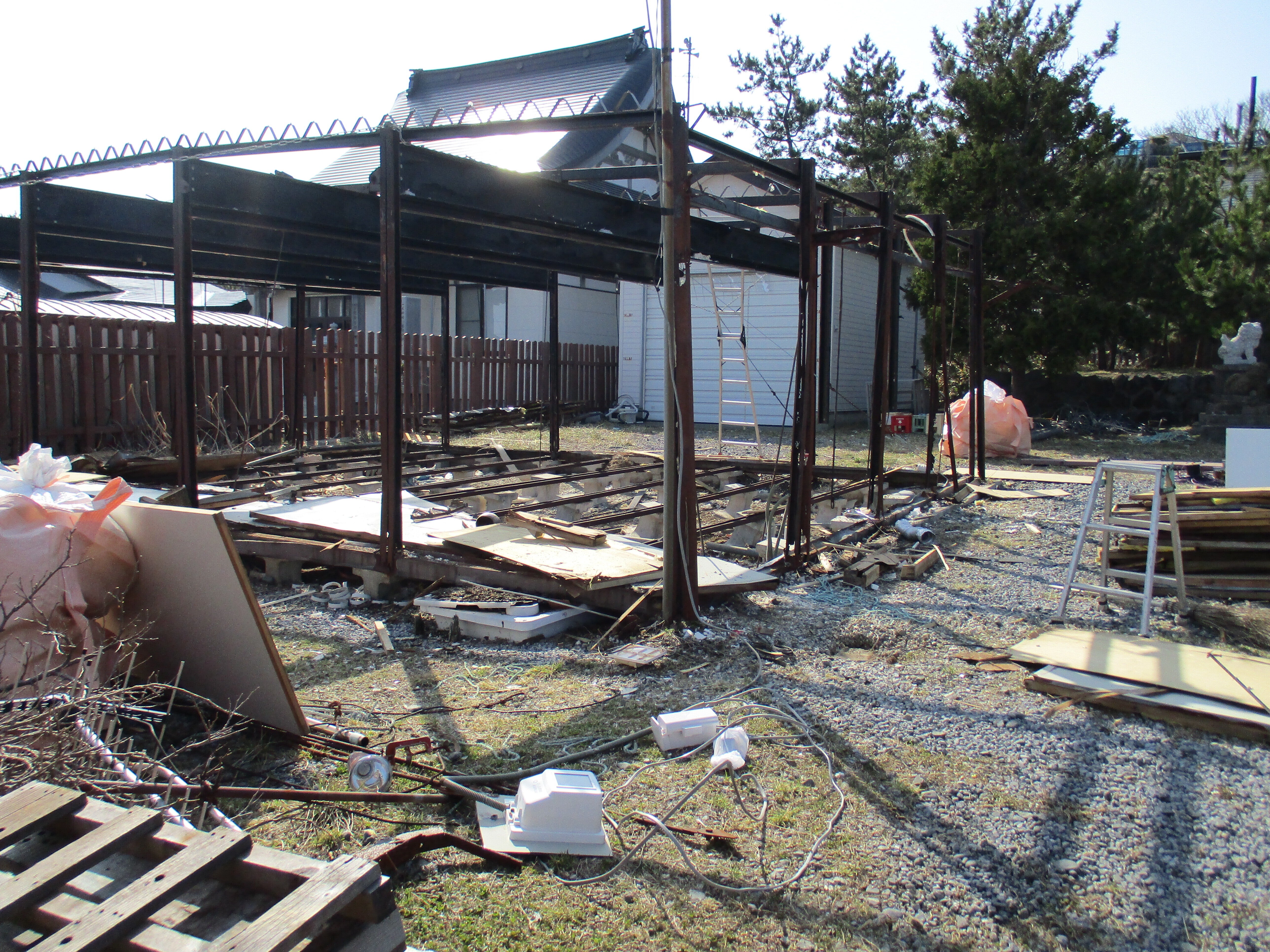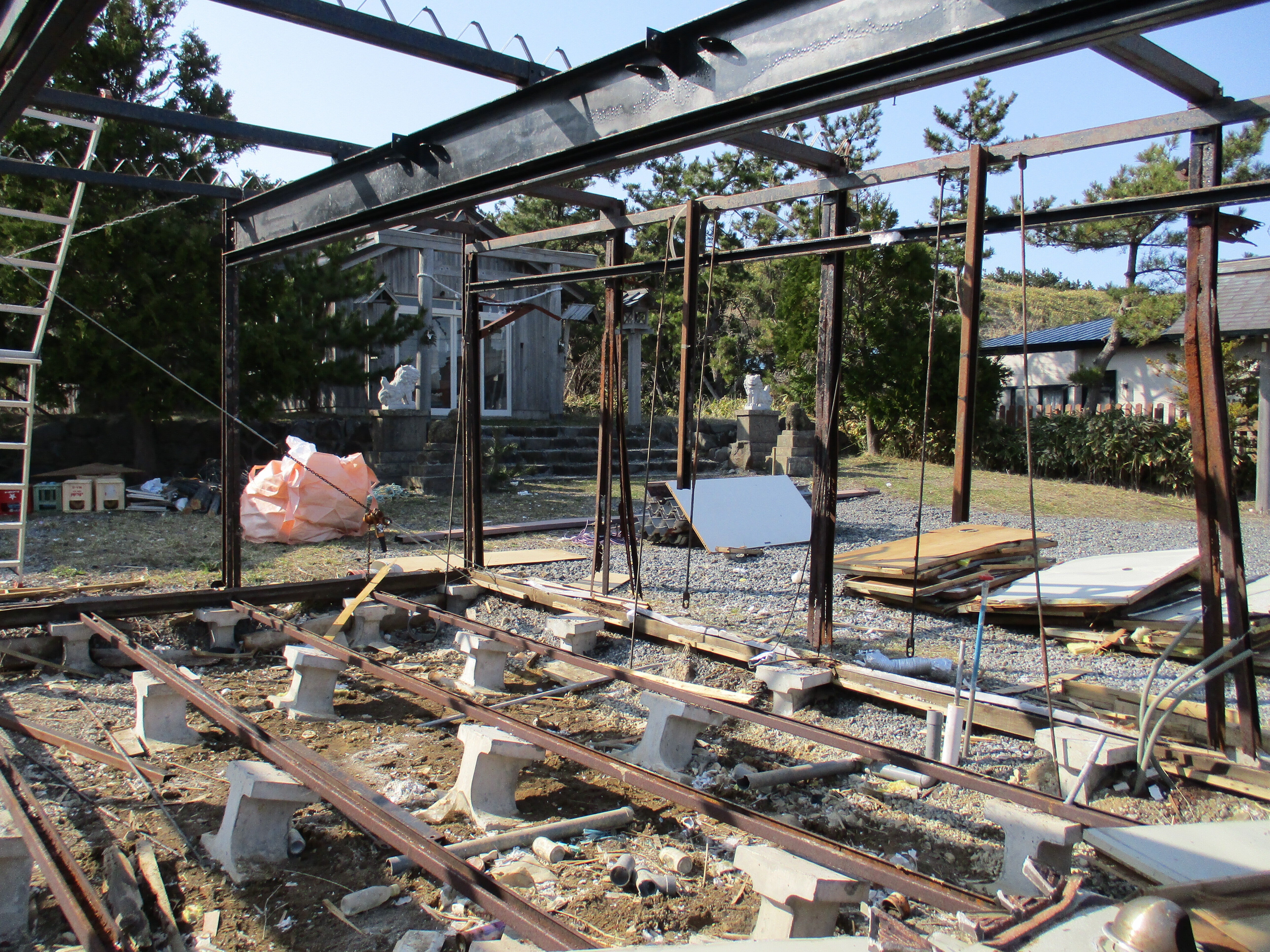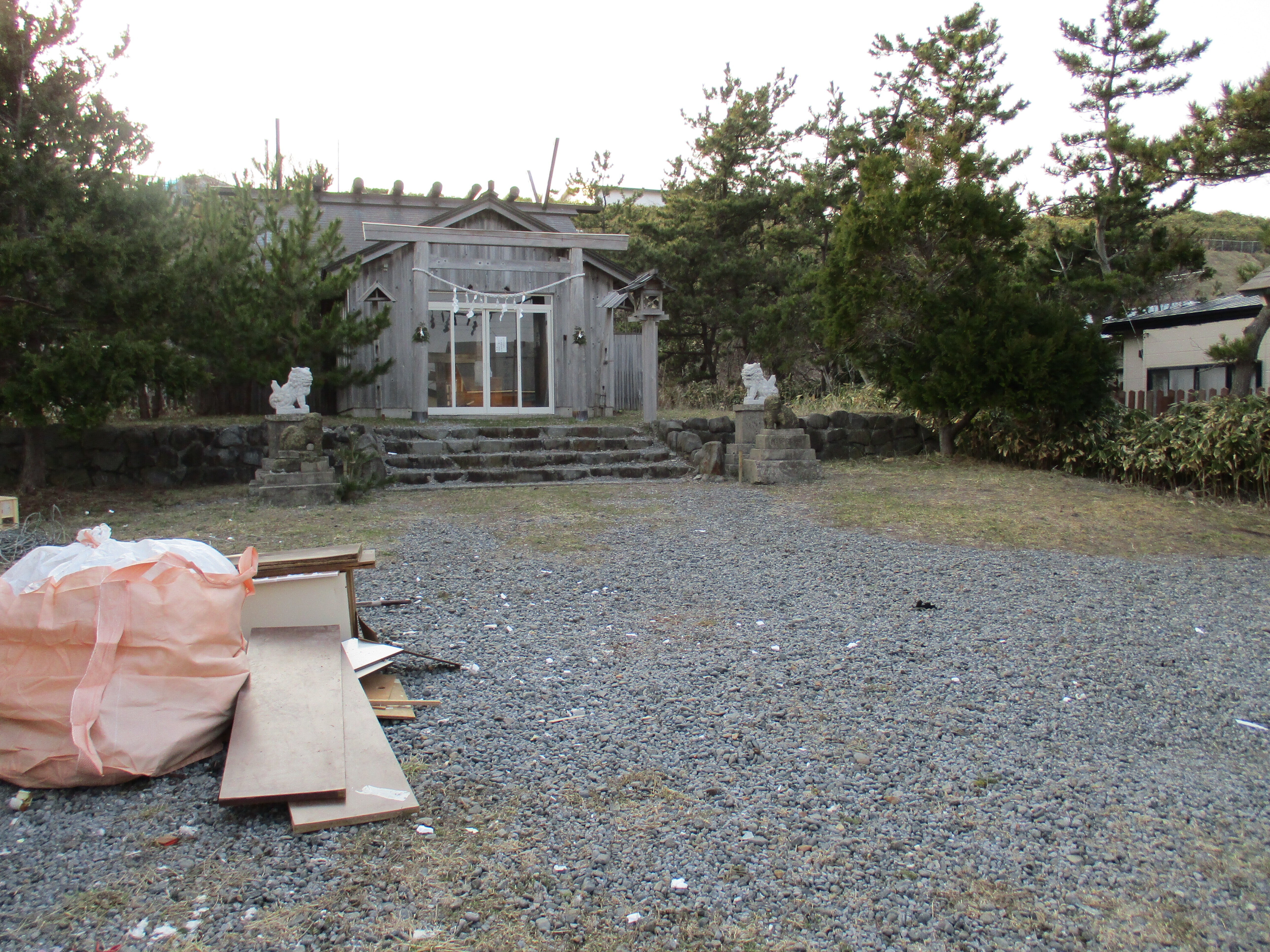 こんにちは、今の青苗の事代主神社です、事務所を解体していますよ、ここまで来ました。後一息です、捨てるのに多くのお金がかかるよと言われましたが。廃棄物は意外とお金がかかるものですね。31日まで支援金を募集しています。返礼品を用意しています、島のワインやお酒もありますよ、礼状、御朱印は別便で送ります、支援金の40パーセントほどをお返し致します。明上雅孝。