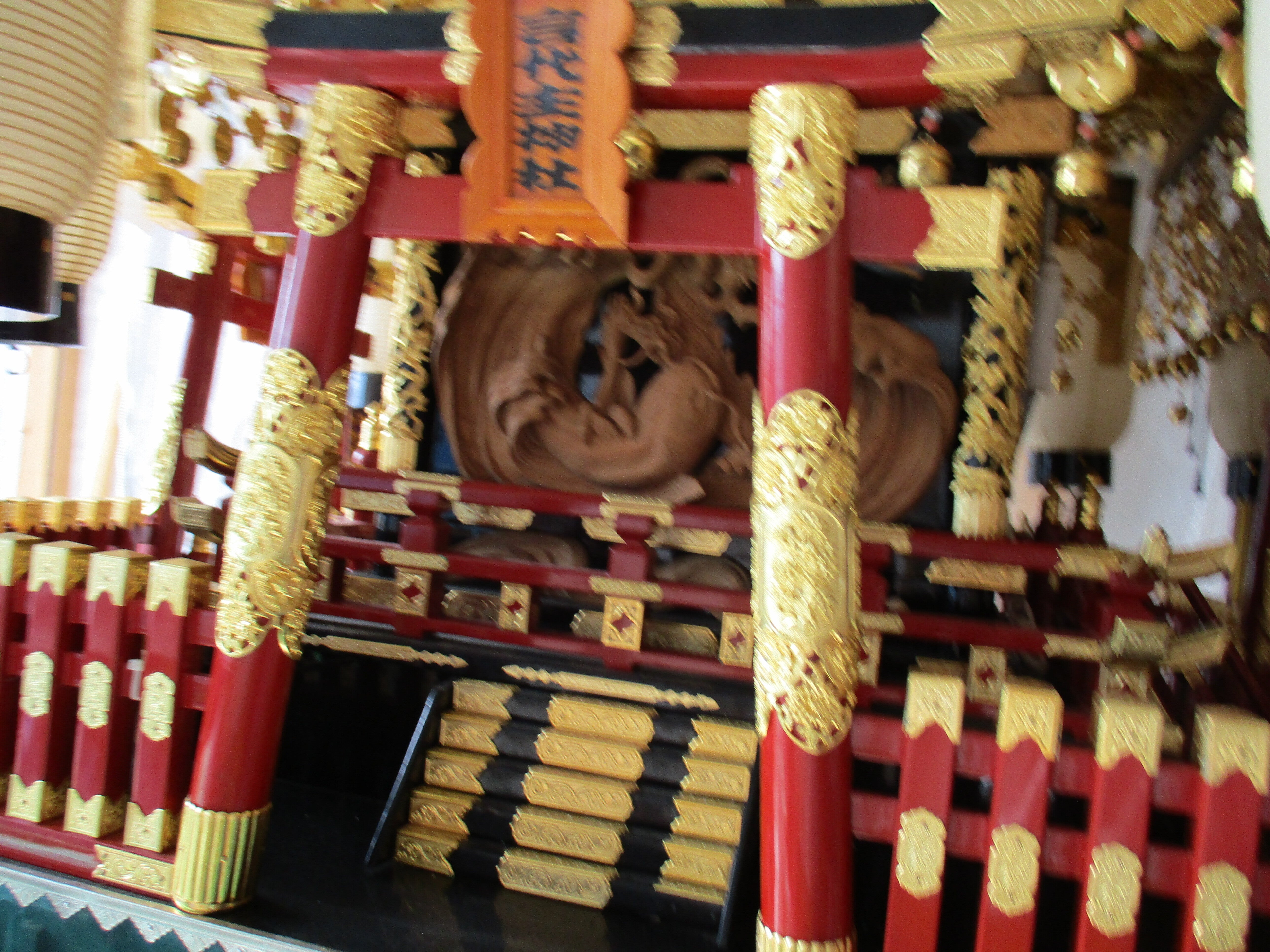 こんにちは、地震災害の後に購入した神輿です、平成13年に神輿が祭りに参加となりました、製造されてる富山刑務所より購入しました。重さ全部で600Kあり30人で担ぎますが、担ぎ手不測の時は20人で担ぐことになりますよ。特徴は富山の彫刻家、南部白雲さんの彫刻が彫られています、地震を起こさぬようにと、鯰が龍に抑えられてます。台車付きで850万で購入しました。住民アンケートを取りました。作る前に。明上雅孝。