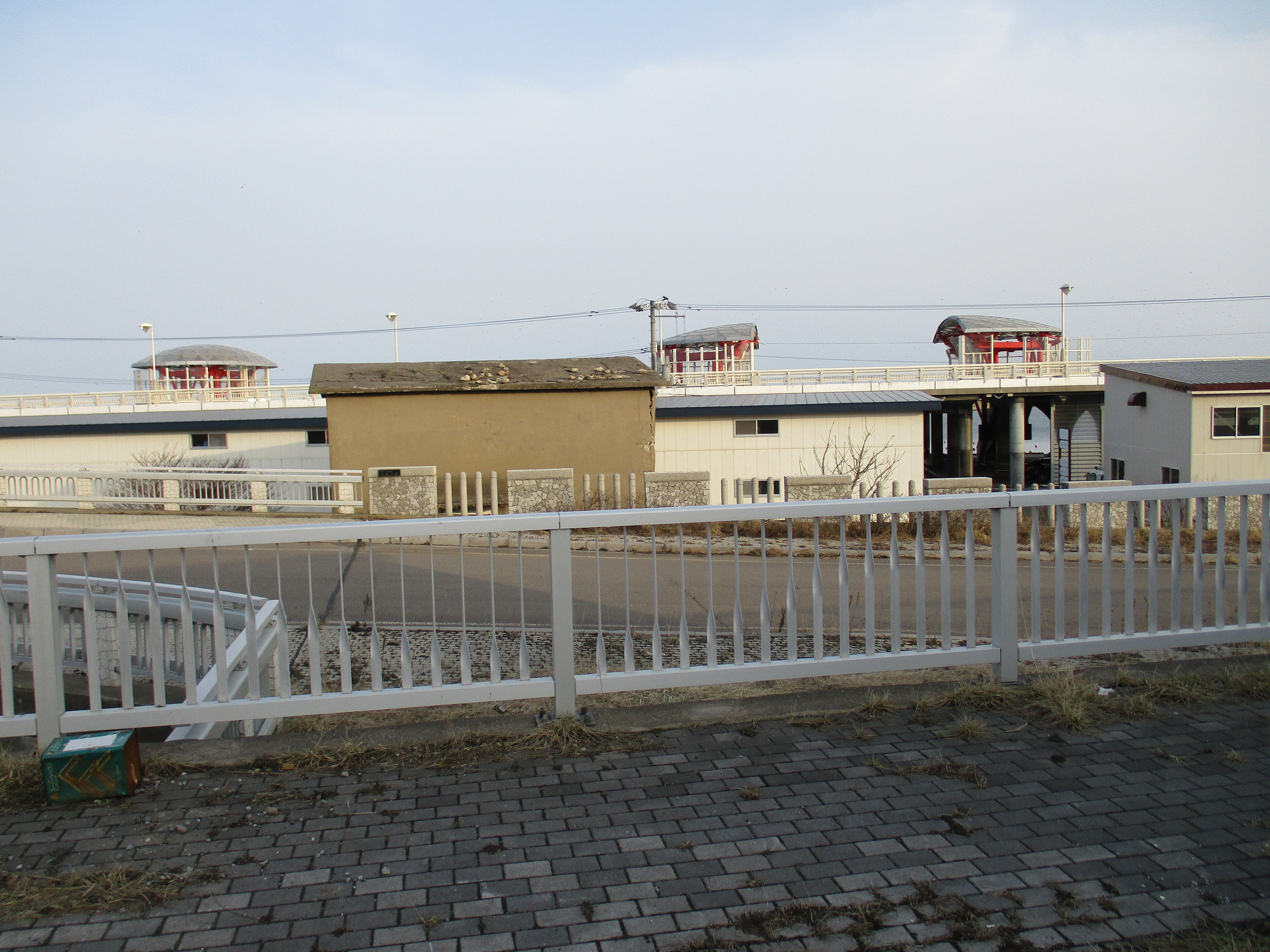 こんにちは、島は晴れの5度。前に見えるコンクリの建物は地震災害で残りました。後ろはウニ向きの工場で、その後ろは避難場所の人工地盤ですよ、海抜7,7で、2、300人を収容できます。明上雅孝。