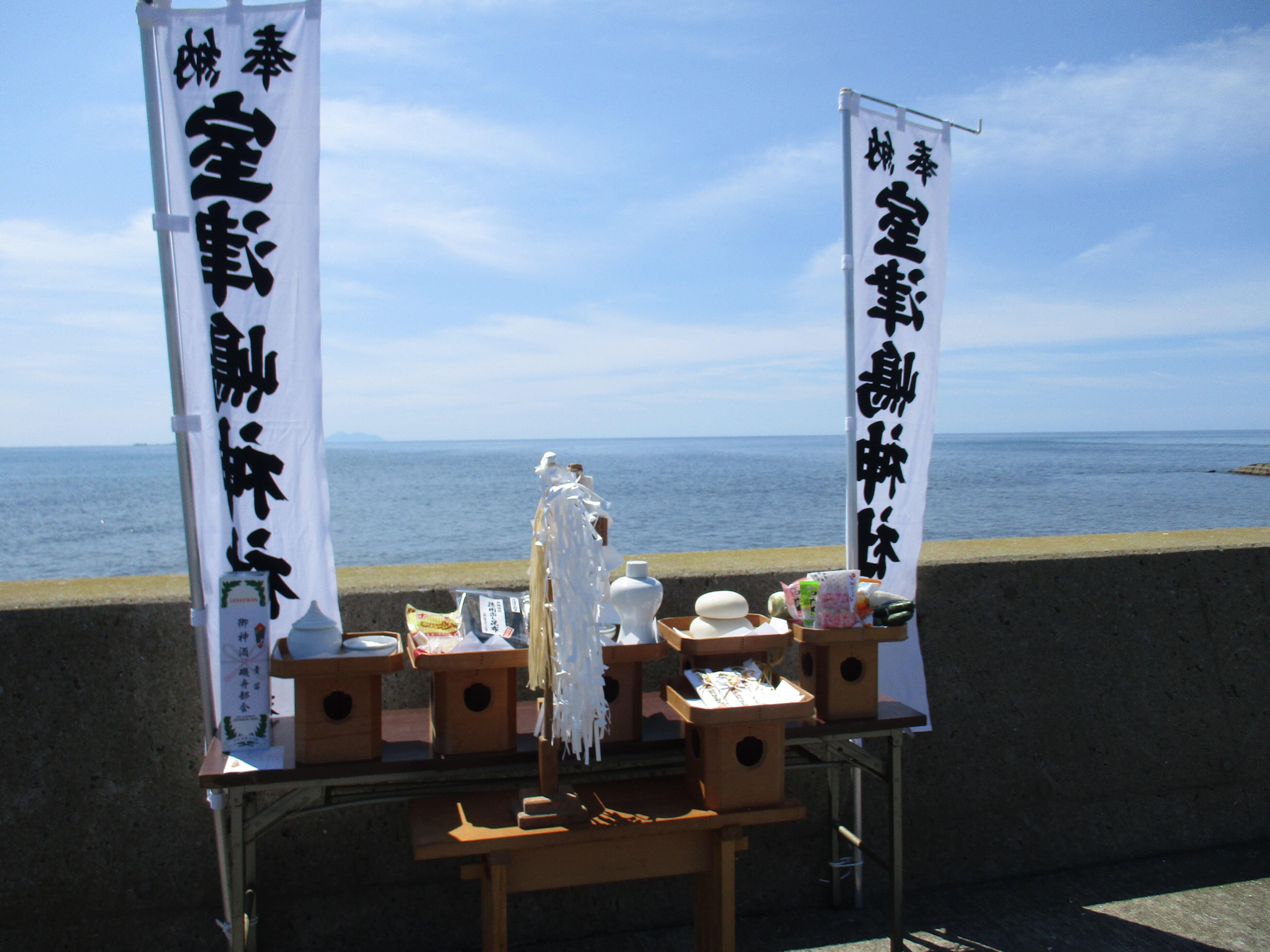 こんにちは、島から4K離れた場所に室津島神社があります。今年は船で行けずに21日に丘での参拝になりました。名古屋からの奉納のお菓子なども、上げさせてもらいました。明上雅孝。見えてますお供えの餅はこの度も江差町からの購入です。フェリーに積んでもらいます。明上雅孝。