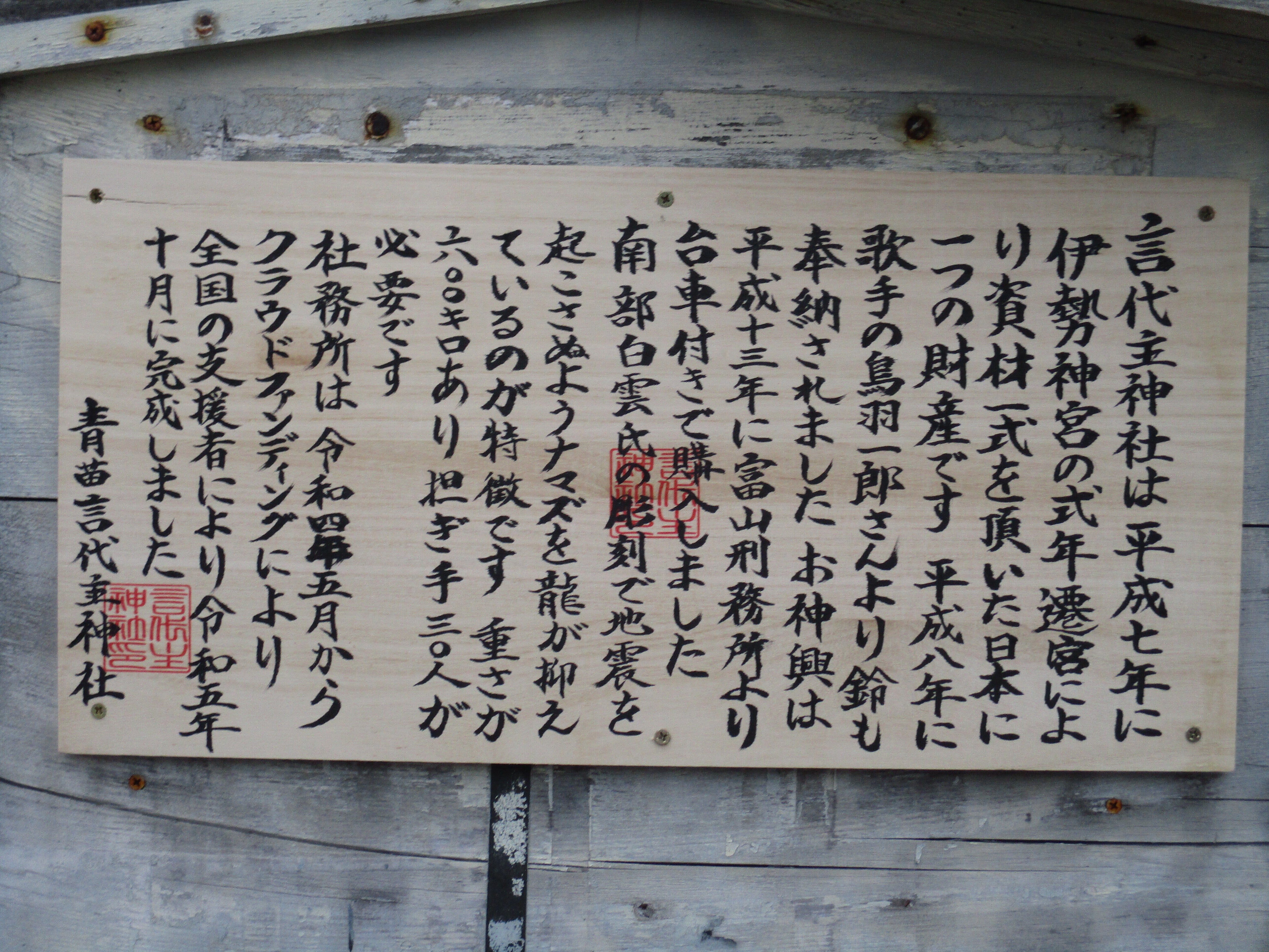 こんにちは、青苗の事代主神社です。扉は月讀み宮の入り口になります。8月12日からは青苗の事代主神社の例大祭の予定です。4年間はお神輿も出ていません。今年は何とかの声がありますよ。明上雅孝。