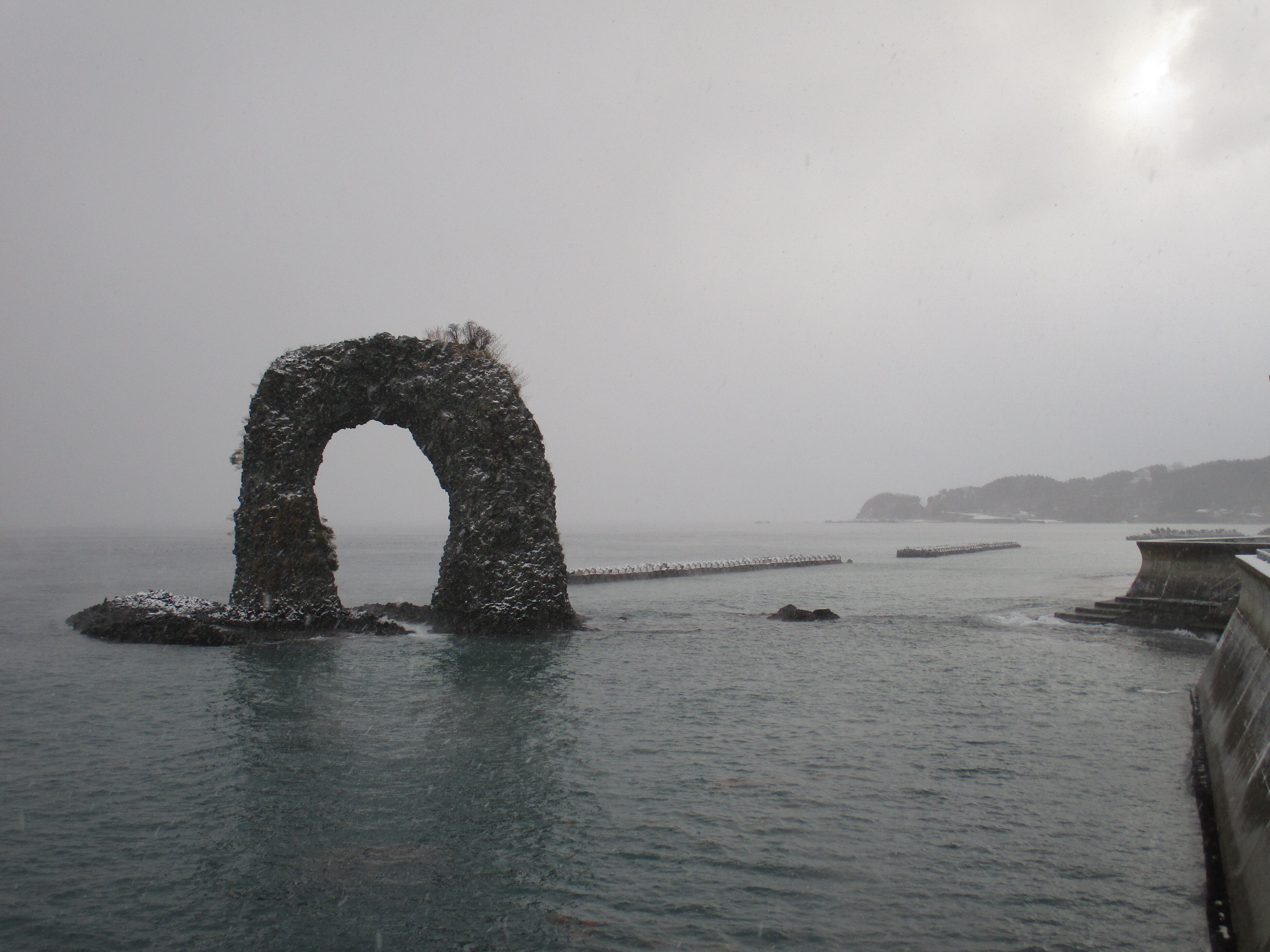 こんにちは、奥尻島のシンボルのなべつる岩です。鍋を持つ手に似てるところからですよ。観光客が多く、写真を撮られてます。31年前の地震災害で崩れ、修理をしました。今は足では渡れません。陸から離れています。明上雅孝。