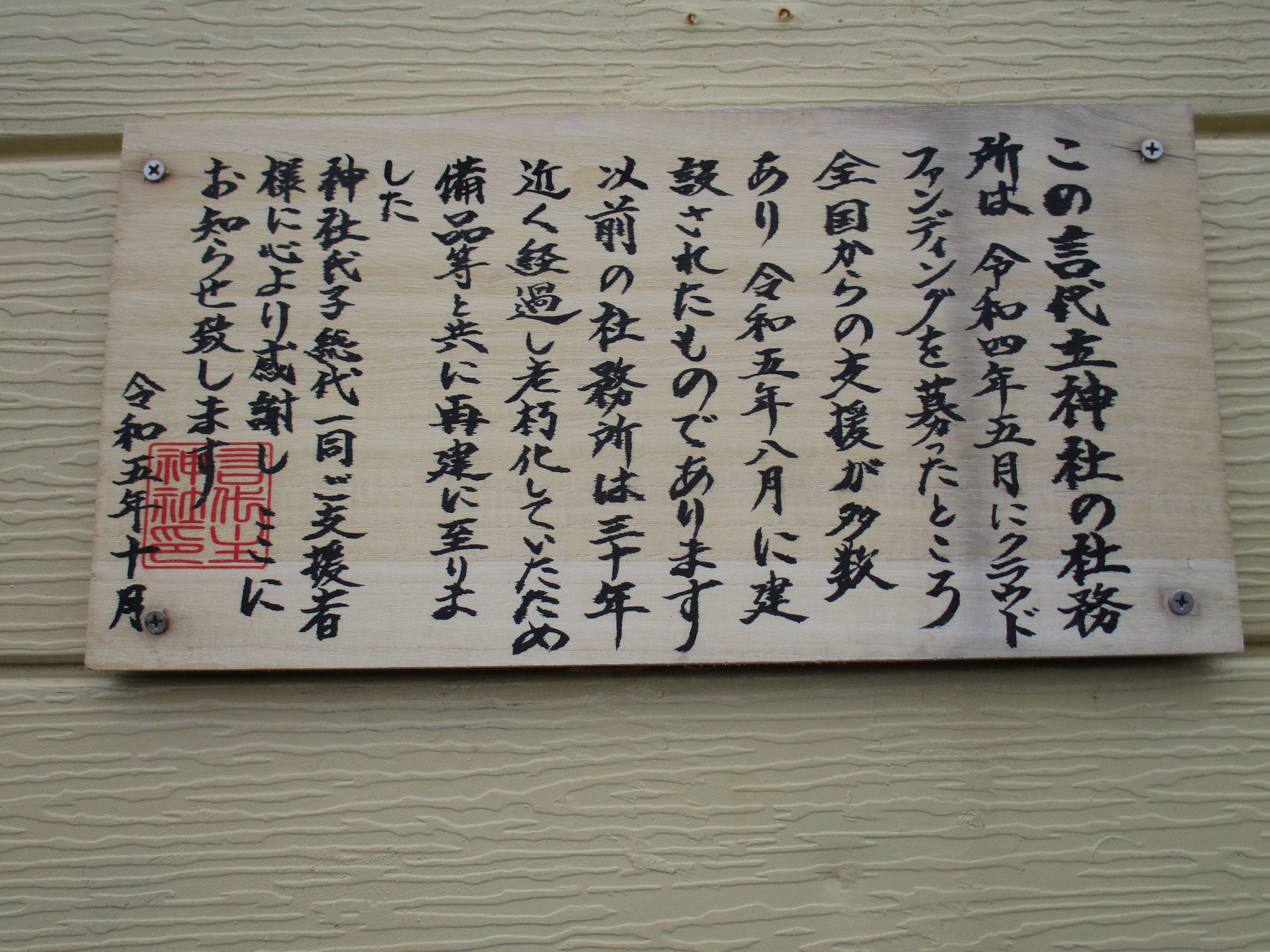 こんにちは、青苗の事代主神社の社務所の案内板です、入り口に、クラウドファンデングのおかげですと、示しています。宮津弁天宮にも修理の事を示します。参拝者にもわかりますように。クラウドファンデングのおかげですと。後世に伝えます。ここも宮司さんは常勤していません。090-5984-1384,明上雅孝。