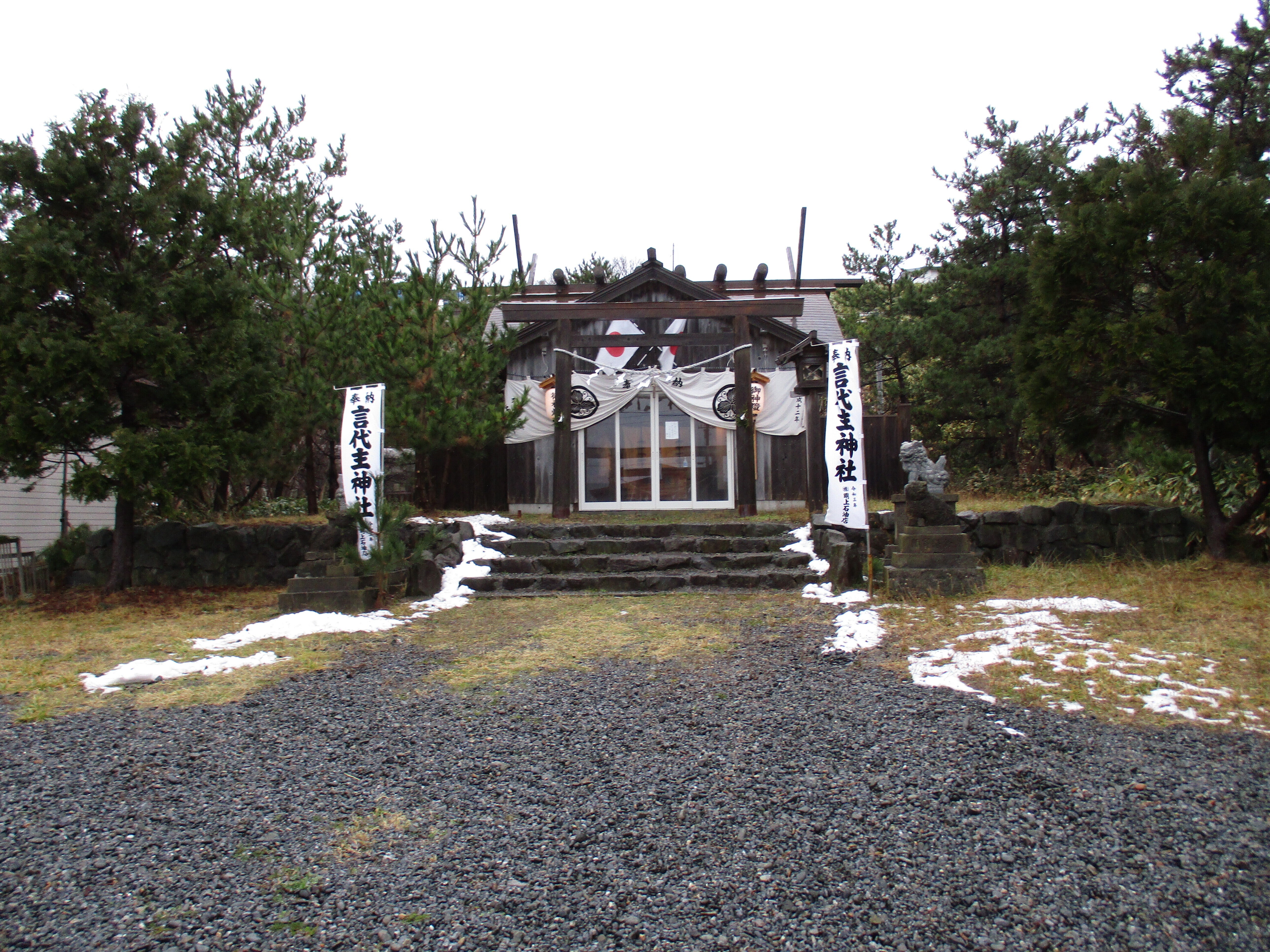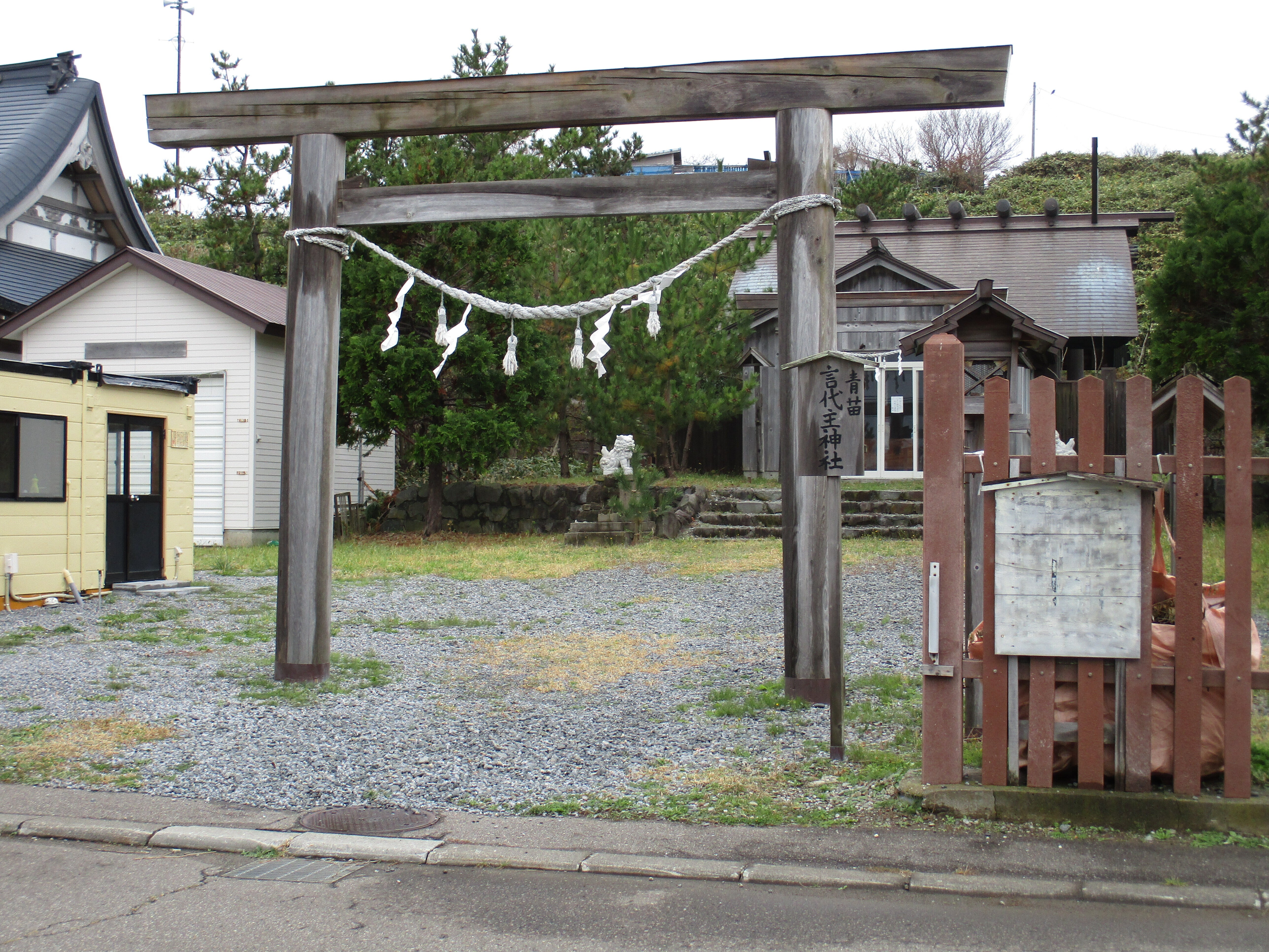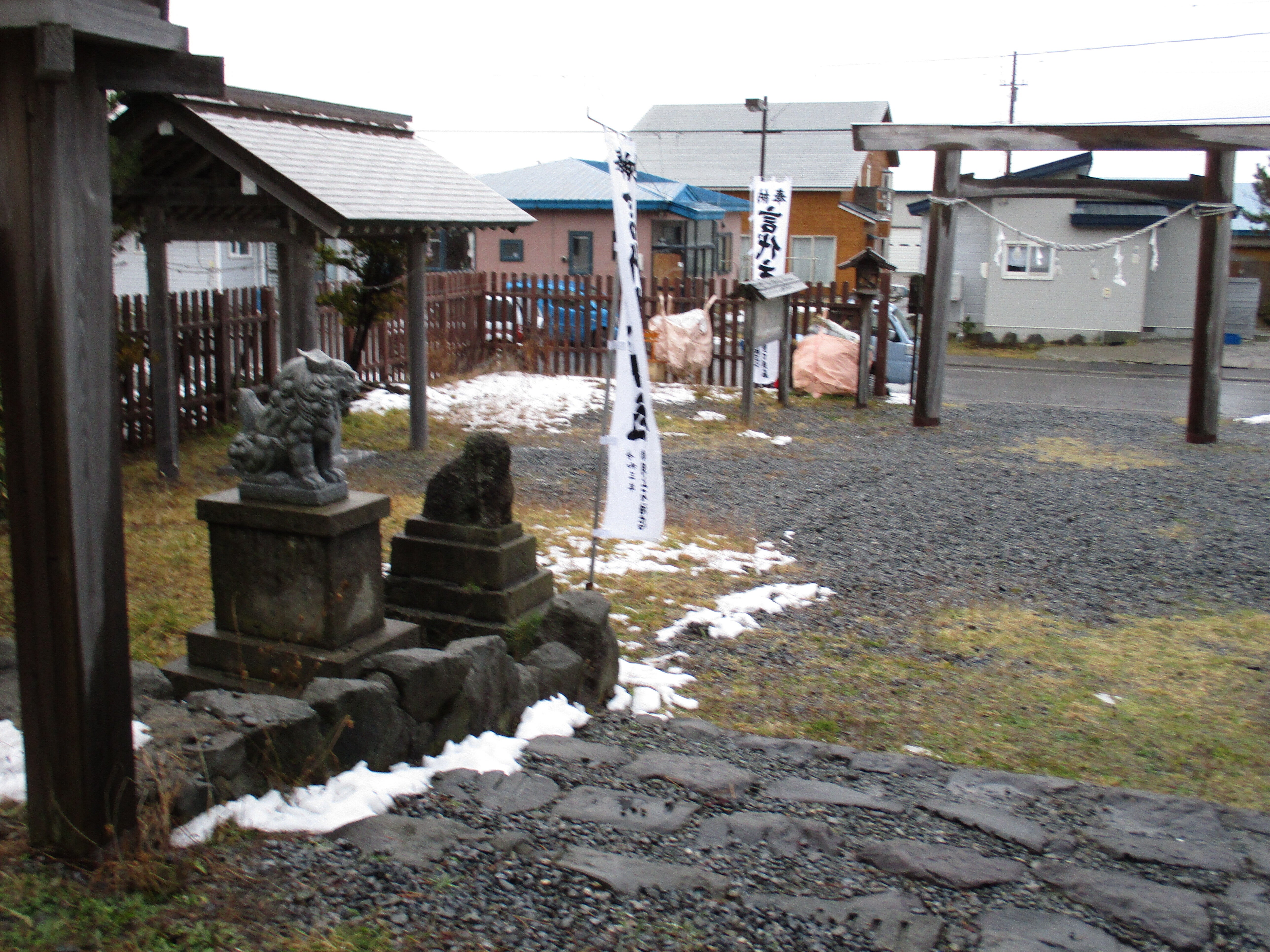 こんにちは、地震災害から30年が経ちましたが、前に見える狛犬は古いのが地震災害に耐えました。新しのは災害後の狛犬です。道路を挟んで今は隙間なく住宅が建設されています、災害前は、神社は少し離れていたようです。明上雅孝。
