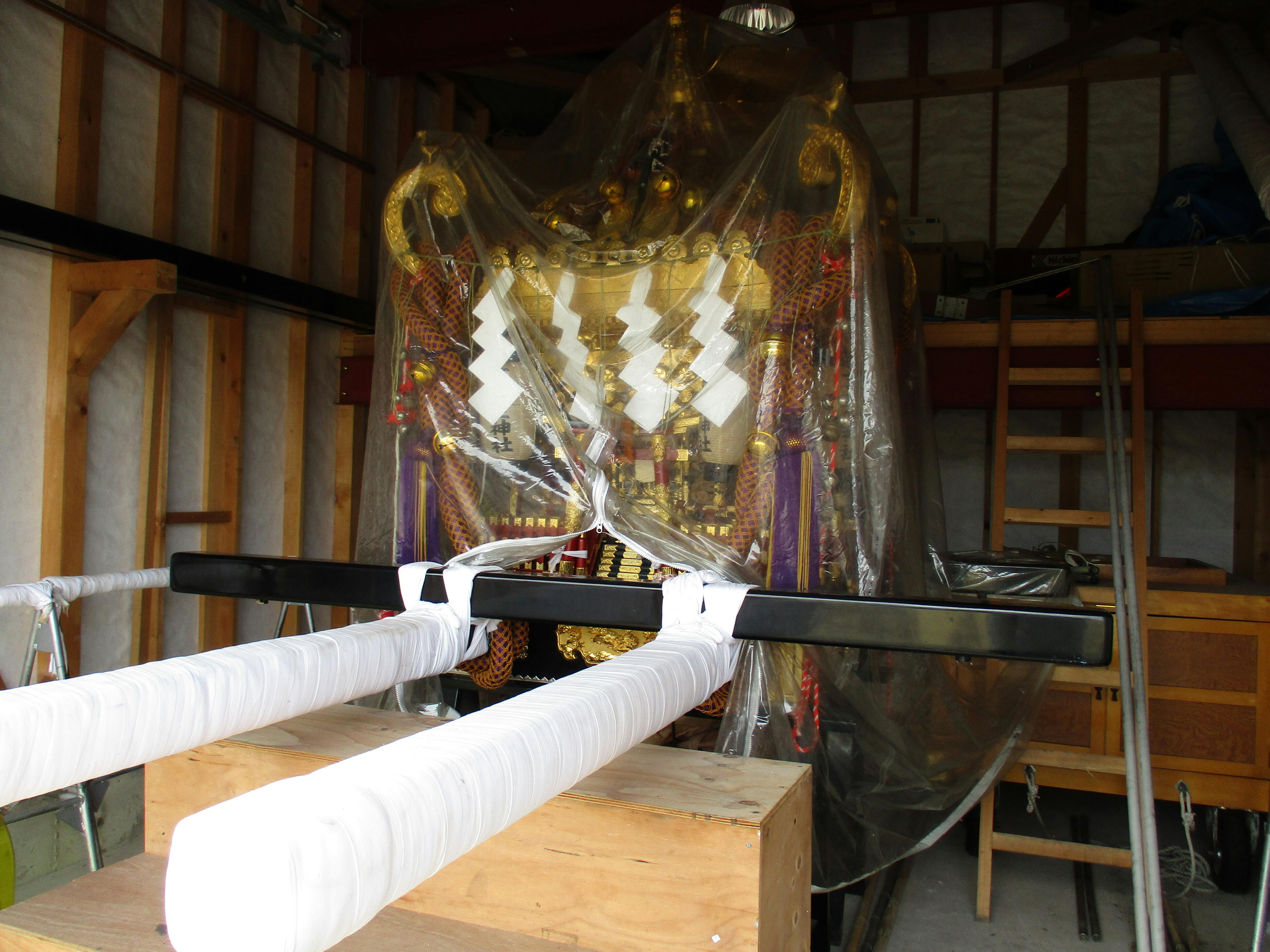 こんにちは、いよいよ今年はお祭りに御神輿がでれるかもね、600キロの重さがあり担ぎ手30人が必要です。人手不足の時の為に台車も購入してます。製造元の富山刑務所より購入しました。製造元なので全部で850万で変えました、住民のアンケート調査から始め5年計画を2年目で完了し、平成13年のスタートになりました。町内を回り完成のお知らせをしました。地震を起こさぬように龍がナマズを押さえています、富山の彫刻家の南部白雲氏により刻まれました。日本に一つと思います、神社、お神輿、歌手の鳥羽一郎さんからの奉納された鈴、クラウドファンディングでの社務所の完成、備品の購入、簡易水洗トイレの完成。どれも絵になります。参拝時は案内板に記載してますのでご覧ください。明上雅孝。