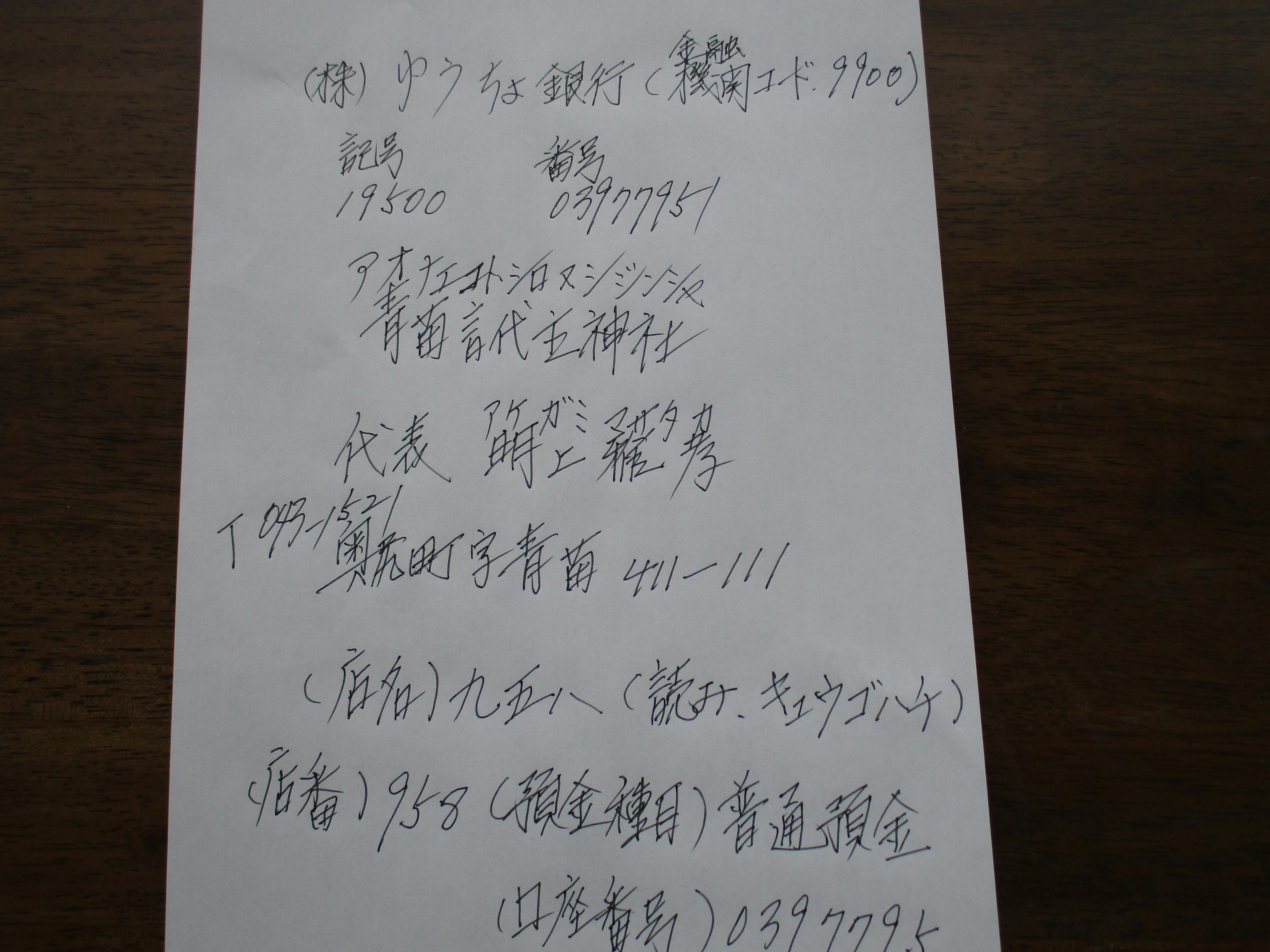 こんにちは、郵便局の通帳です、維持費の為に1本になりました。御朱印希望の方はお知らせください。確認後に郵送しています。明上雅孝。