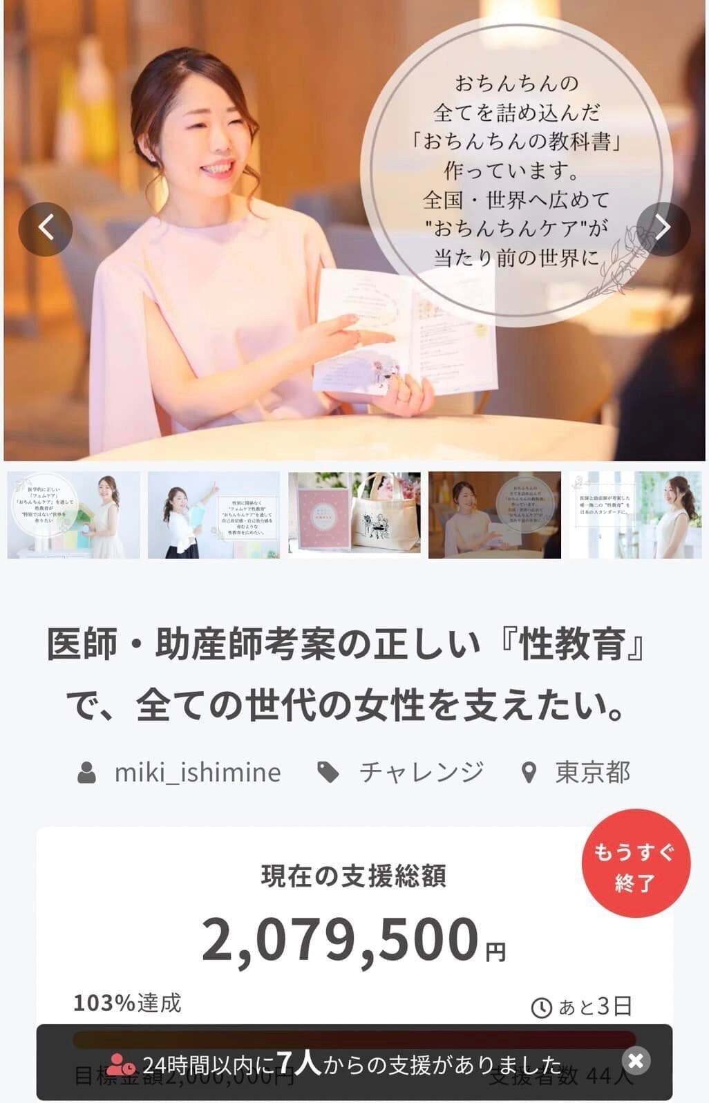 5月31日にスタートしたクラウドファンディング【フェムケア、おちんちんケアを通して医学的に正しい性教育を広めたい】55名の方から、2,632,500円のご支援をいただき7月31日終了しました。ご支援くださった皆さま応援メッセージをお届けくださった皆さま情報拡散にご協力くださった皆さま応援くださった皆さま今回のクラウドファンディングに関わってくださったすべての方に心よりお礼申し上げます。期間中、皆さまからいただいた応援コメントは、毎日楽しみに拝見しておりました。目標を達成したいという励みにもなりましたし、同時に皆さまの声を社会へ届ける貴重な機会となりました。また、今回のクラウドファンディングを通じて初めて出会った方々もおります。当協会の活動が少しでも知っていただけるきっかけとなったのならとても嬉しいです。いただいたご支援は性教育プロジェクトに大切に使わせていただきます。活動の様子については、このキャンプファイヤークラウドファンディングやホームページ、SNSなどでお伝えしていきます。是非、引き続き活動を見守っていただけましたら幸いです。Miki s House助産院 院長Midwife M 腟Beauty協会 代表石嶺 美紀