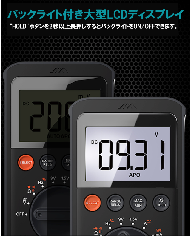 バックライト付きLCDディスプレイ搭載で、暗い場所でも作業可能です!
