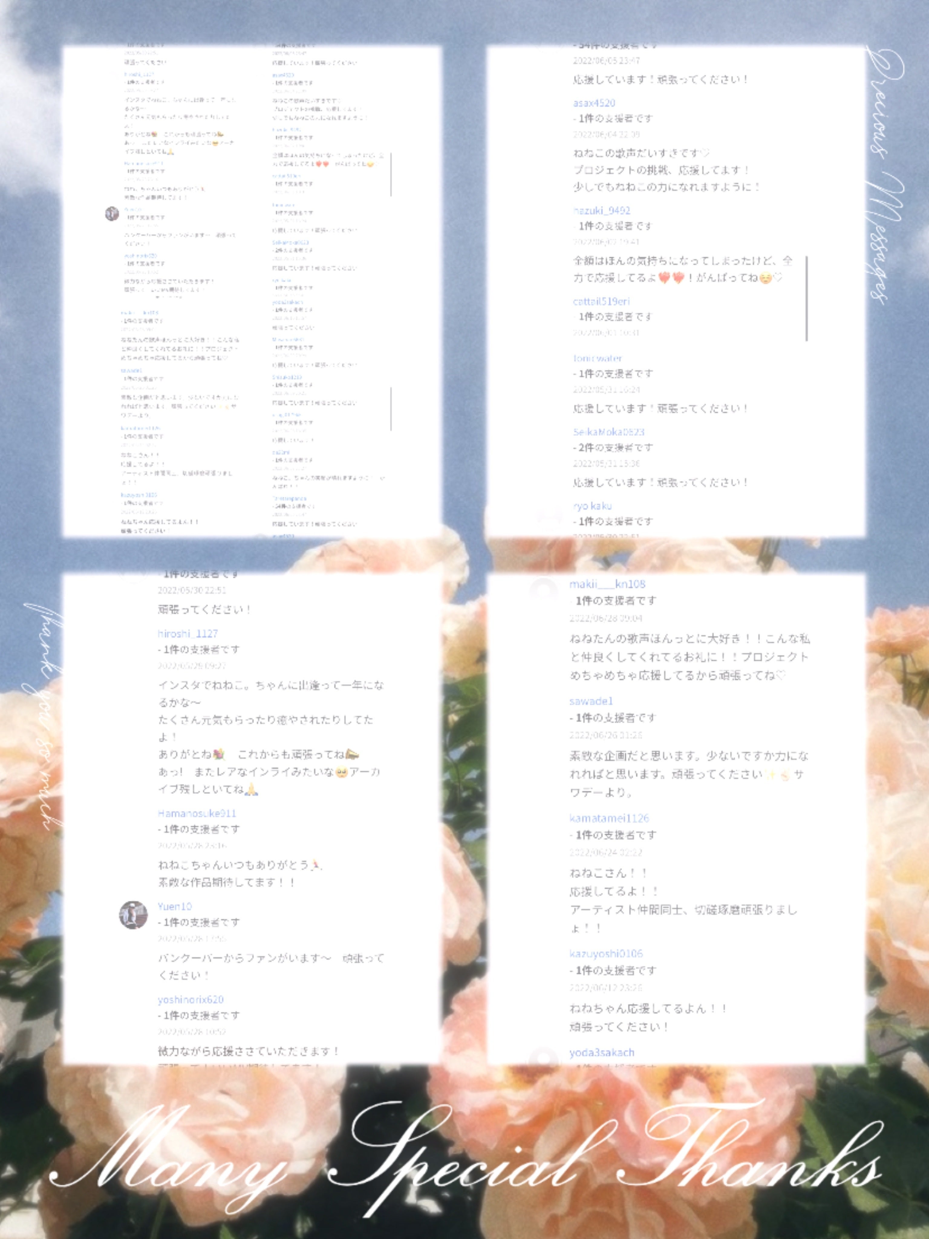 こんばんは、ねねこです。(=^ェ^=)いつも活動を応援してくださっている皆様、本当にありがとうございます。なんだか暑すぎる日が続いてますが、大丈夫ですかみなさん...?しっかり水分をとって、お日さまに負けないくらい、アツい夏を迎えたいですね。。。!さて、いよいよ!今年1番アツい、初挑戦のクラウドファンディングが 『達成まであと15%』残すところなんと8日間となりました〜!!正直スタート前はこんなに早く、沢山の方にご支援をいただいただけるとは思わず、改めて支援者の皆様への感謝の気持ちを伝えたいです。皆様のお力とエールのお言葉なしではここまでくることができませんでした。本当に本当に、心からありがとうございます( ; ; )♡♡ちなみに今回の画像は、嬉しすぎて感動でウルっときてしまったメッセージ集です。学生チーム一同、必死に準備を進めています。そして、今週はついに撮影現場に入ると同時に、現場参加リターンもいよいよスタートします!!お会いできるのが楽しみで待ちきれない、裏方のシンガーソングライターです。現在、脚本はもちろん、どんなロケーションでどんな日程で撮影を進めるか、どのキャストにいつ現場に入ってもらうか、といったさまざまな工程が組み終わっていよいよ撮影です...!!そして私も撮影には全日参加いたします。裏方兼どこかで登場する役、頑張ります。ぜひ本編で探してくださいね(⁎⁍̴̆ ⁍̴̆⁎)皆さまお一人お一人からのご支援とメッセージを胸に、目標達成に向けて、まだまだ走っていきたいと思います。是非、『こんなプロジェクト支援したよ〜』と拡散していただけるととっても力になります。。!引き続き、短編ドラマプロジェクトへのアツーーいご協力、よろしくお願いいたします!!!2022.06.29 ねねこ。