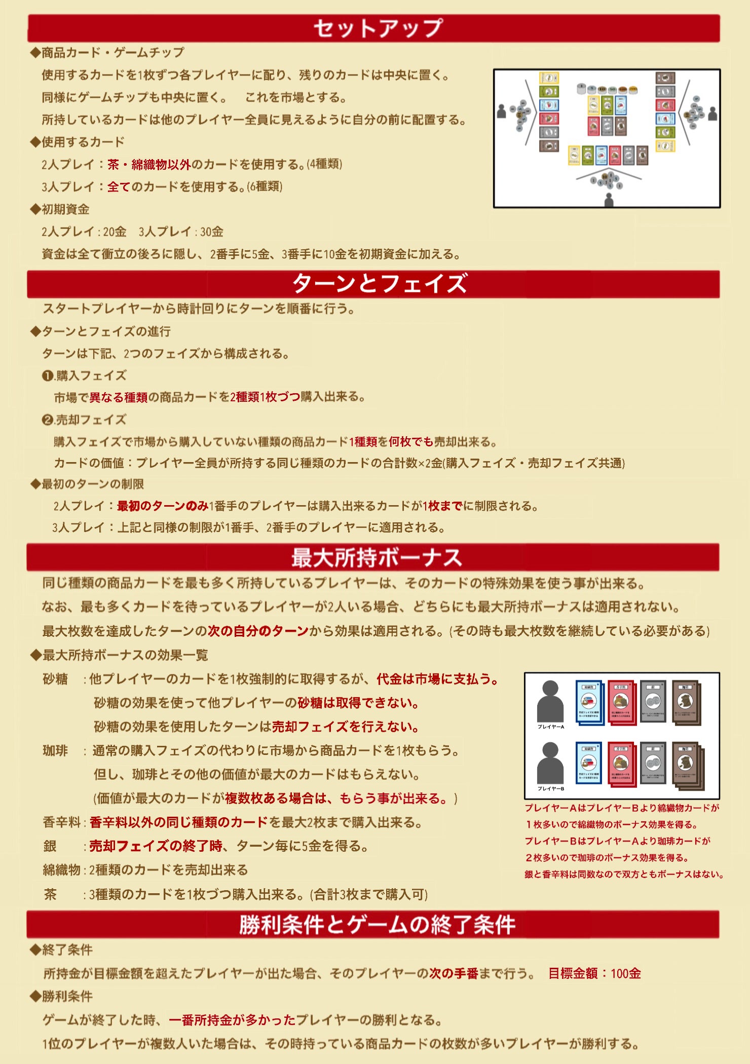 ゲームの終了時、最も所持金の多いプレイヤーが勝利する。