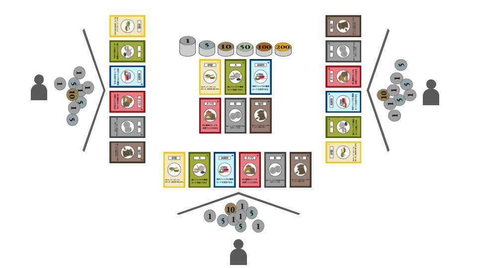 余った商品カードと資金を場の中央に置きます、これを「市場」と呼びます。