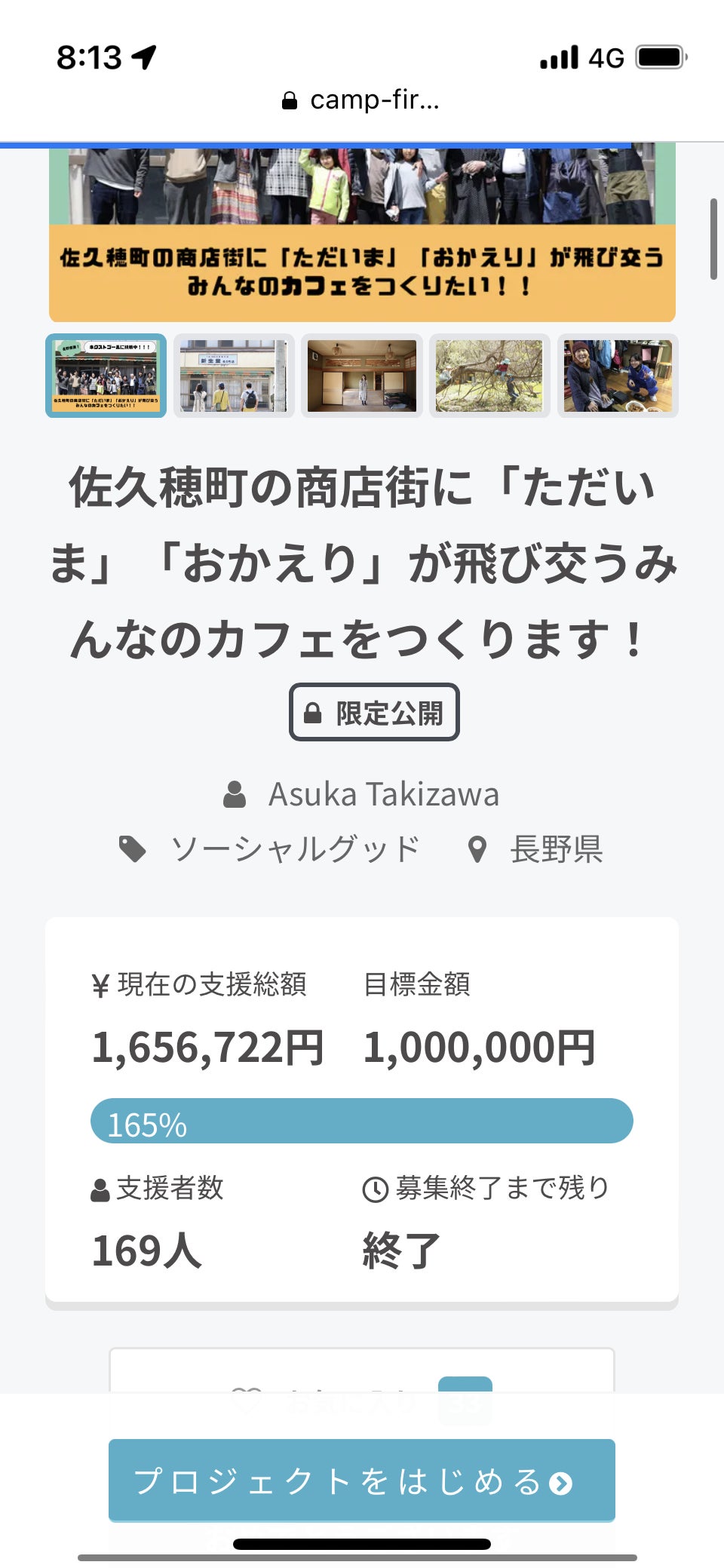 昨日 (6/19.23:59)をもちまして、クラファン終了いたしました!!!◆結果発表!!!目標100万円のところ...1,656,722円もの金額を集めることができ、終了いたしました( ; ; )人数としては、170人の方にご協力いただきました( ; ; )!!!!!本当にありがとうございました!!!人数が多いことも嬉しいです...!!!( ; ; )◆実際...2年前から住まわせてもらっているこの町で、新しいことをチャレンジすること。ここからが本当の始まりだと思ってます!!!それでも、「一緒にやろう!」と言ってくれる仲間たちや、商店街の方々、古くからの友人、家族、前職前々職の仲間たち、今身近にいる仲間、自分は本当に多くの仲間に支えられて今があることを、クラファンを通して改めて思い知らされました!!それから、クラファンを通して初めて繋がれた方々、佐久穂町や八千穂にルーツがある方、普段では繋がることが難しい人にも、幸運にも出逢うことができました!!本当にありがとうございます!!!( ; ; )まだまだ始まったばかり!レポートも続けてまいります!今後とも、ぜひよろしくお願い致します!!皆さまにお会いできる日を、楽しみに準備していきます!!!本当にありがとうございました!!(T_T)!!取り急ぎ御礼まで!m(_ _)m滝沢明日香