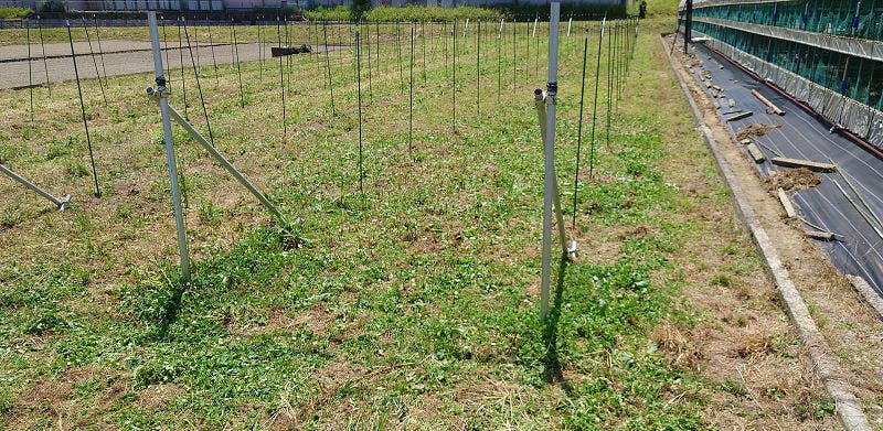 2022/05/26 13:10先日、支柱に架線を張り、テンションを懸け終わりました。緩み止めの結びになっているはずなので、大丈夫とは思いますが。^_^;上の画像の右側の列です。どちらもメルロー。資金難につき後は6月に2列設置します。当面草刈りにいそしみます。 もっと見る