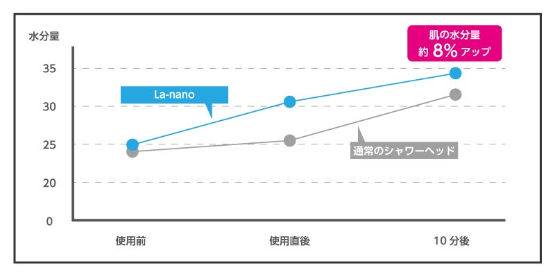 ※La-nanoと通常のシャワーヘッド5分間肌に当て続けた時の水分量を比較