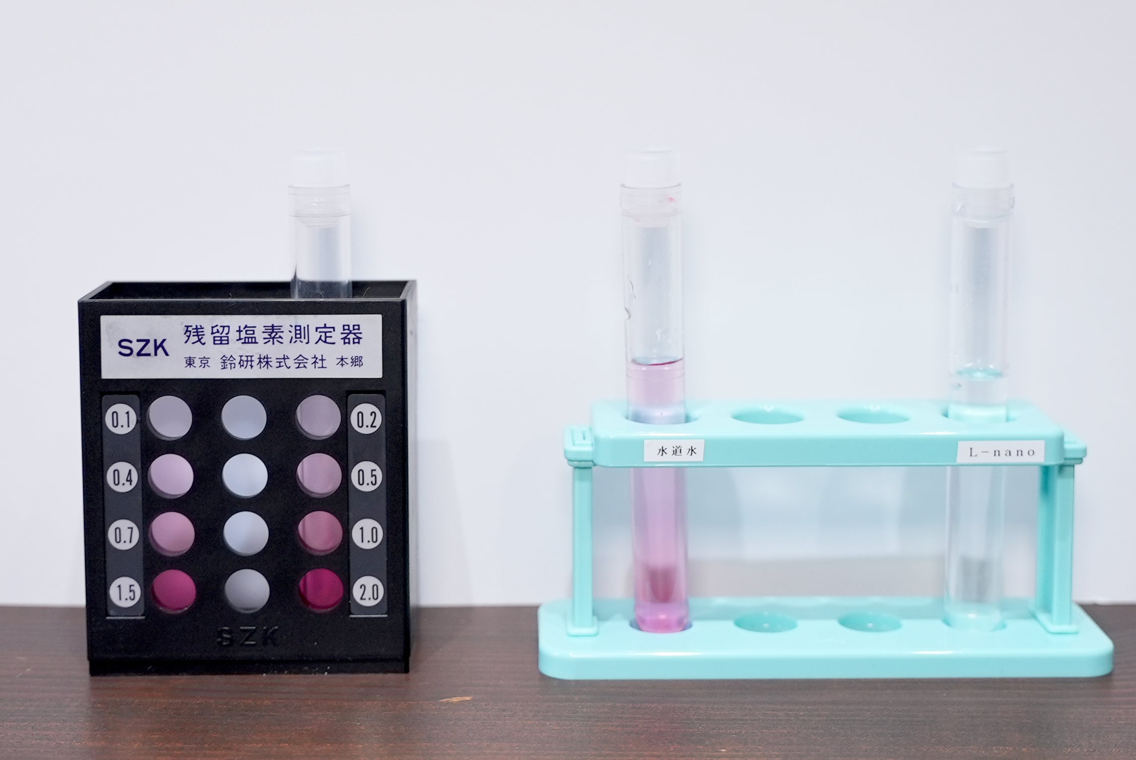 塩素があるとピンク色に染まる試薬を使い、通常の水道水とLa-nanoを通した水で、