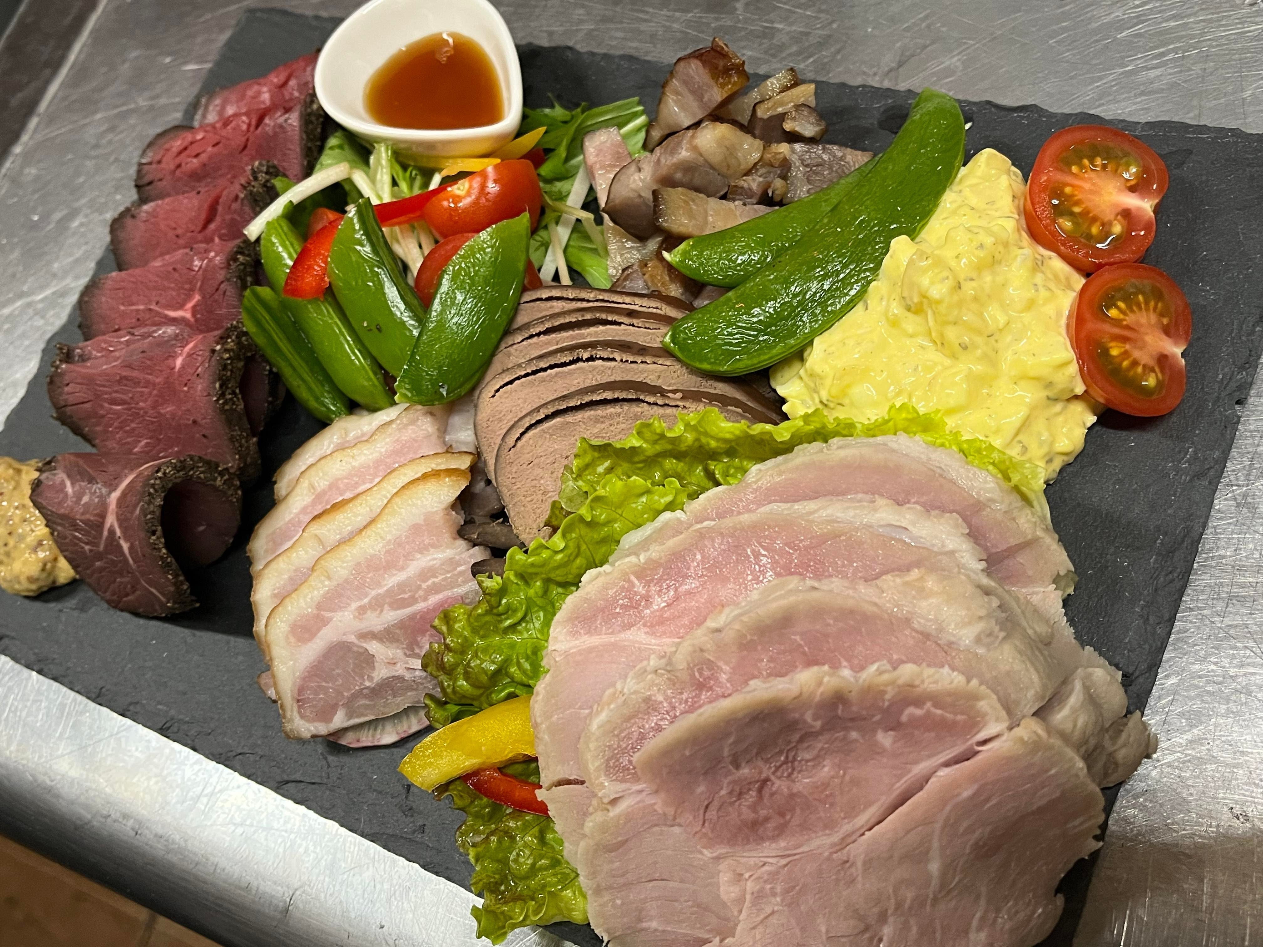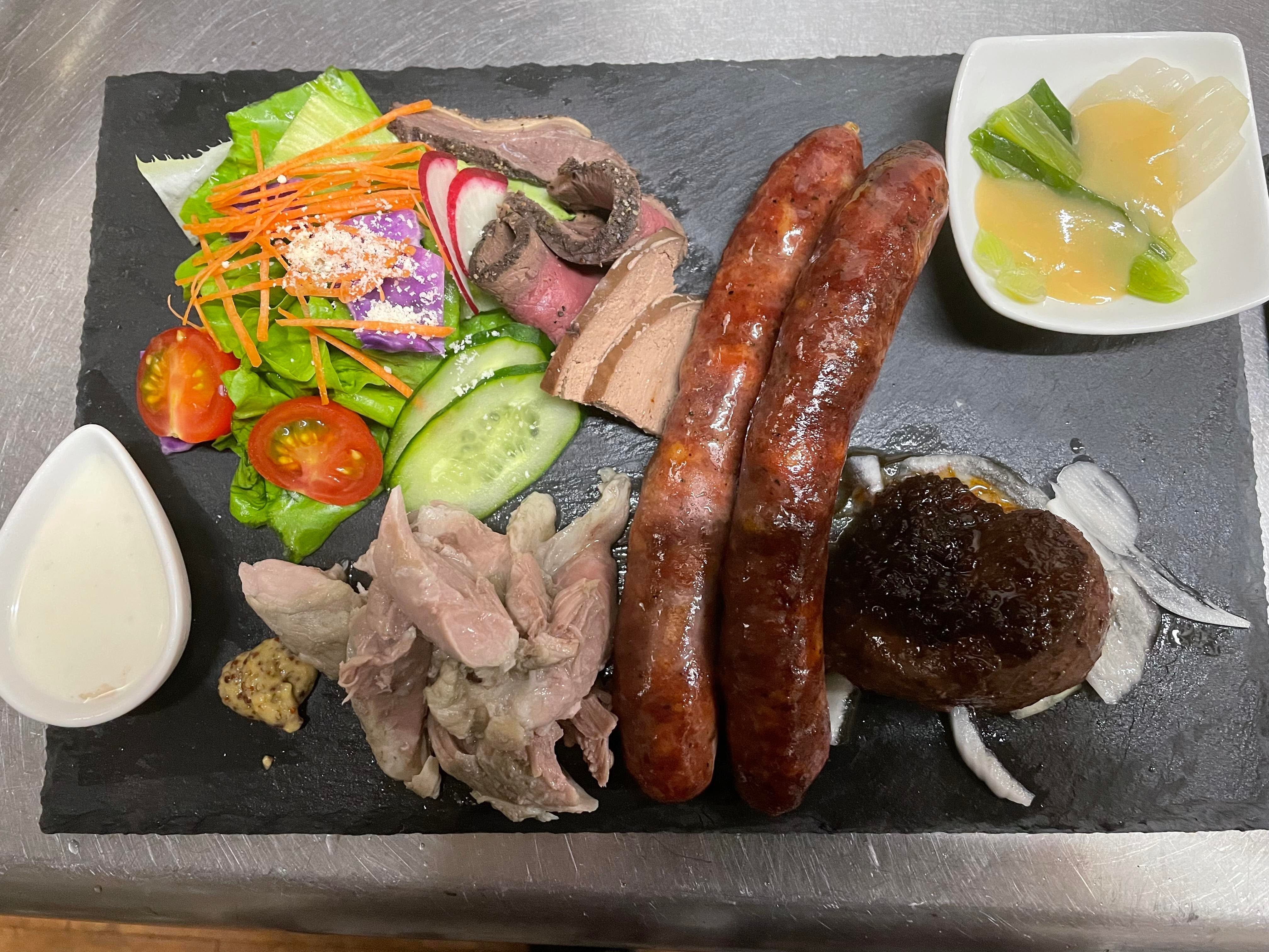 ジビエ料理の数々。左より猪肉のアイスバイン、鹿肉のパストラミ、鹿肉フランク、鹿肉のステーキ。