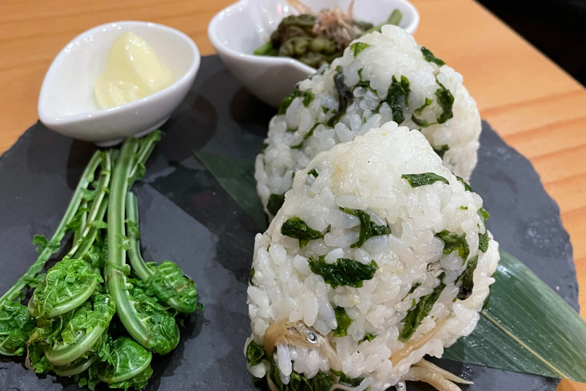 「山菜の女王」といわれるコシアブラのおにぎり。左側はこごみ、奥の小鉢はわらびのおひたし。