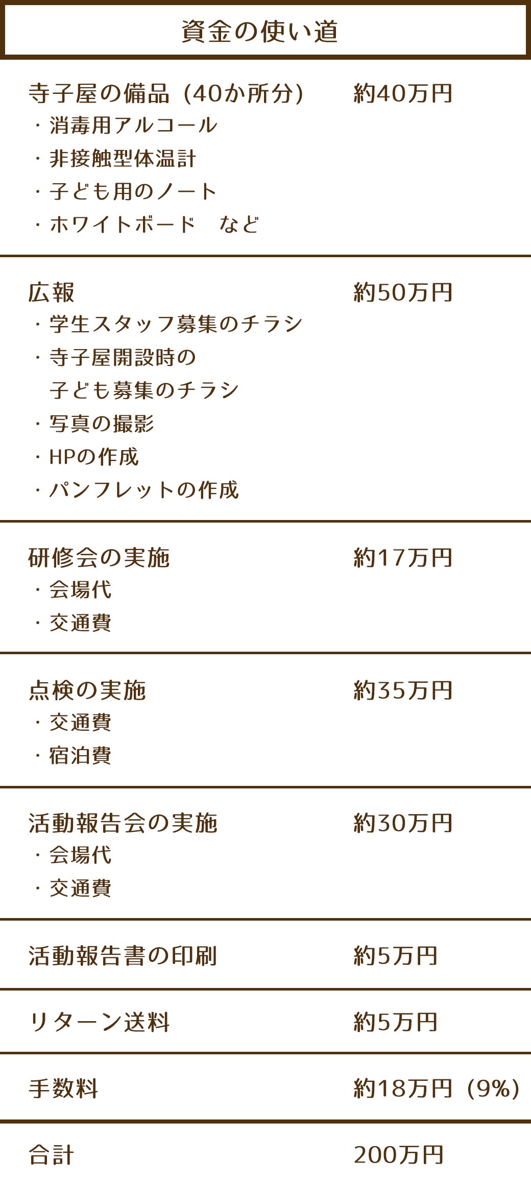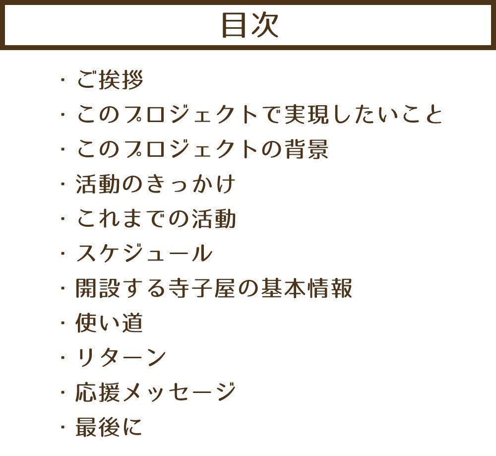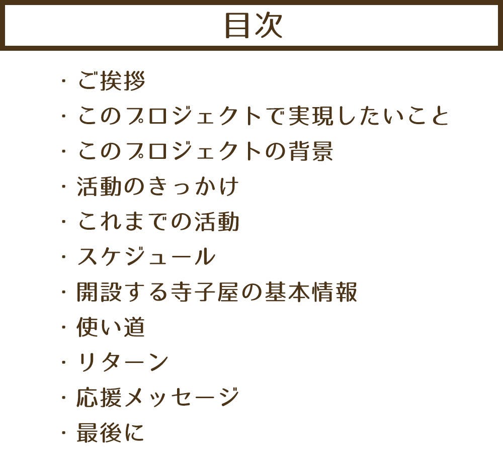…全国各地の寺子屋のスタッフからお礼の気持ちを込めて書いた手書きのお手紙をお送りいたします。プロジェクト終了後、1か月以内に郵送する予定です。