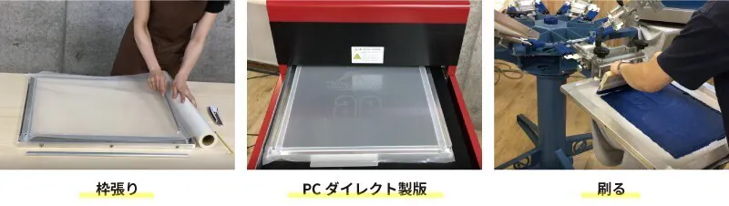 正式には「シルクスクリーンプリント」といい、色ごとに版(スクリーン)を作って1色ずつプリントしていく方法です。