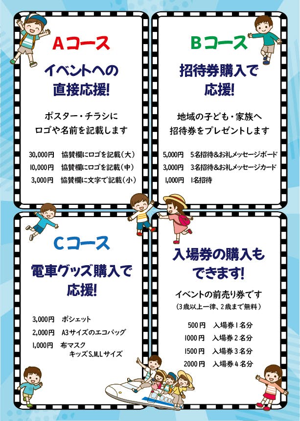 2022/08/14 13:32子鉄フェスタへのご支援、応援ありがとうございます。プロジェクトオーナーの河野です。クラウドファンディング終了後、イベントチケットの一般販売を開始し、昨日全ての回が完売となりました!当日を楽しみに待っているというメッセージやコメントもいただき、大変嬉しく思っております。私どもも、皆様にお会いできることを楽しみにしています。また、先日お知らせしましたチラシ・ポスターについてもご紹介いたします。ご支援コースにありました「協賛欄へのロゴやお名前記載」は、以下のような形でさせていただきました。【オモテ面】【ウラ面】クラウドファンディングを開始した頃は、頭の中にイメージはあったものの、まだ不安なことも多くありましたが、こうしてたくさんの方々にご協力いただき、そしてご支援をいただき、ここまで来ることができました。イベントまで残り3週間となり、準備も大詰めです。準備の様子は、Instagramを中心に報告しております。引き続き応援よろしくお願い致します!きっぷるInstagram→https://www.instagram.com/kipple_group もっと見る