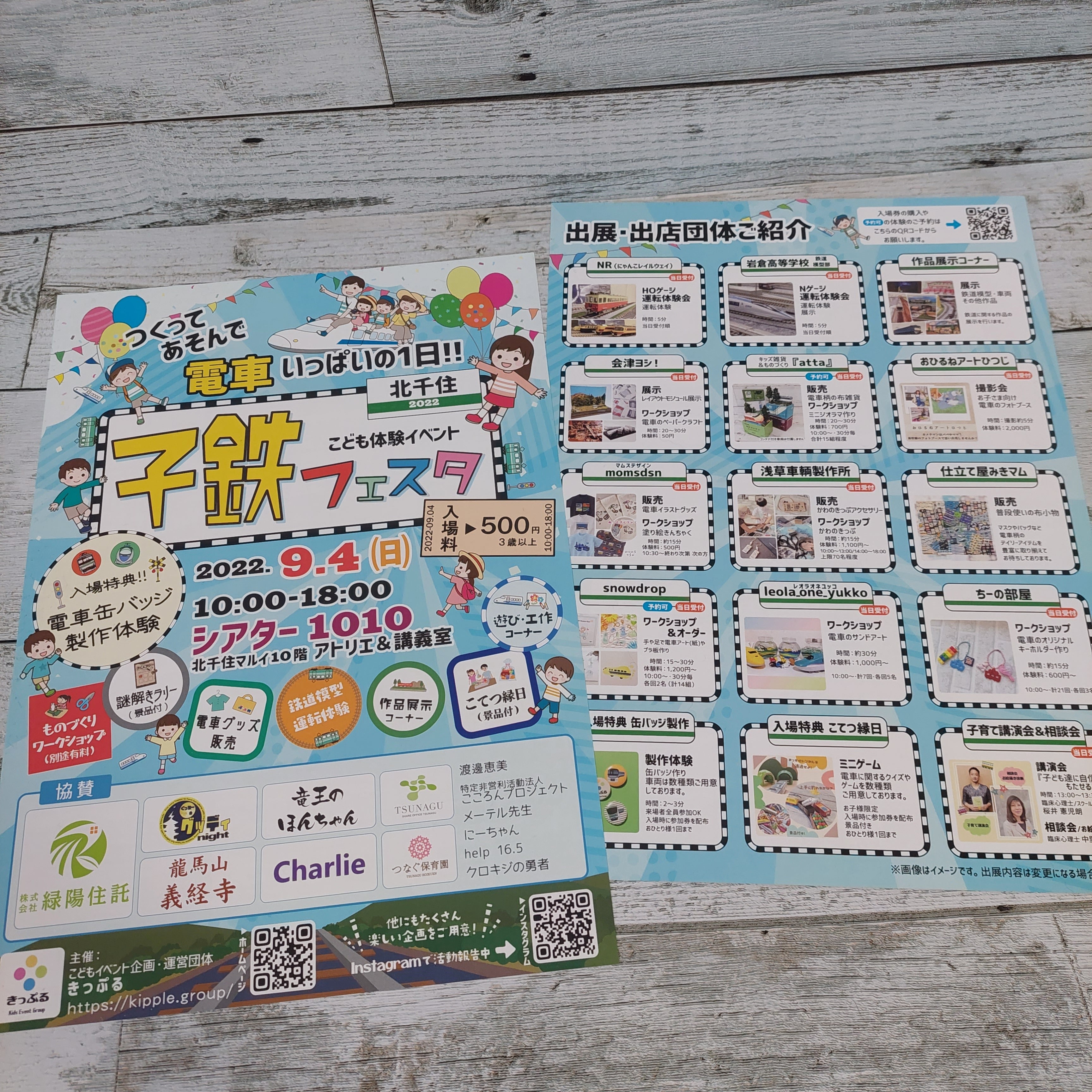 子鉄フェスタまで、あっという間に残り1ヶ月となり、順調に準備を進めております。イベントのチラシ、ポスター、招待券が刷り上がりました。該当コースの方々には、順次発送いたしますので、ご到着を楽しみにお待ちください。また招待券については、地域のお子様達(つなぐ保育園さん、こどもみらい園さん)へ8月上旬にお渡し予定となっております。入場券、電車グッズご購入の方々へも、8月上旬にはご連絡・発送を予定しております。今しばらくお待ちくださいませ。7月中旬から一般販売を開始した入場券は、おかげさまであっという間に10:00~入場の回は完売となりました。たくさんのお子様達に、楽しい時間を過ごしていただけるよう、今後も準備を進めてまいります。引き続き、応援よろしくお願い致します!