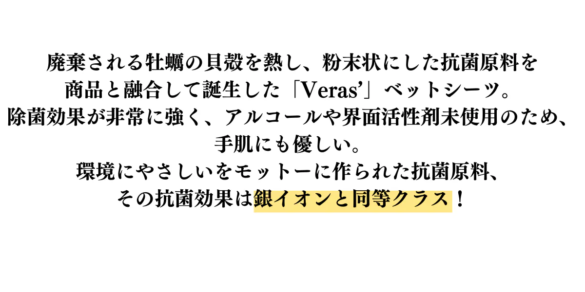 廃棄される牡蠣の貝殻を100%使用し、安全で環境にやさしい天然の抗菌剤を開発し、製品に配合する事により高い抗菌効果のあるベットシーツを開発しました!