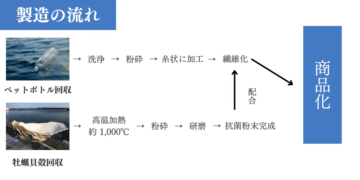 回収したペットボトルを粉砕し、後入念に洗浄され、リサイクルポリエステル原料が完成し、牡蠣の貝殻由来の抗菌パウダーを、配合します。