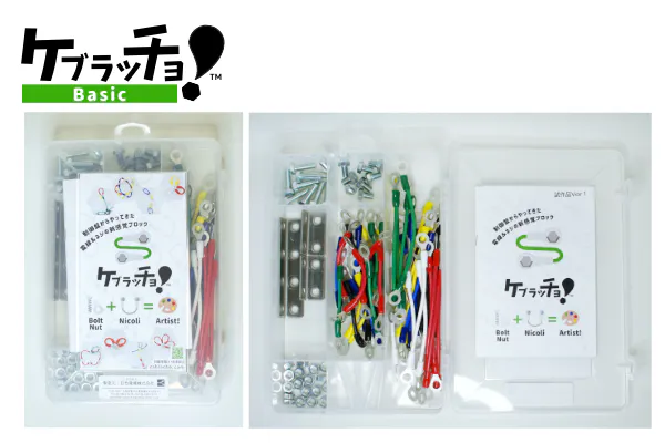 ケブラッチョとは、電線をボルト・ナットで組み合わせて遊ぶブロック玩具です。電線を意味するcableをもとに命名しました。遊び方はとてもシンプルで、電線パーツの輪っかにボルトを通し、ナットを回してとめるだけです。