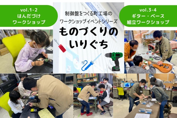 制御盤の製作で培った技術などを活かし、「何か工作をやってみたい、でも自宅で道具を揃えるのはハードルが高いな…」という部分を解決できるようなイベントを弊社工場にて開催しています。vol.1-2でははんだづけワークショップ、vol.3-4では、市販されているギター・ベース製作キットを一緒に組み立てるワークショップを行いました。