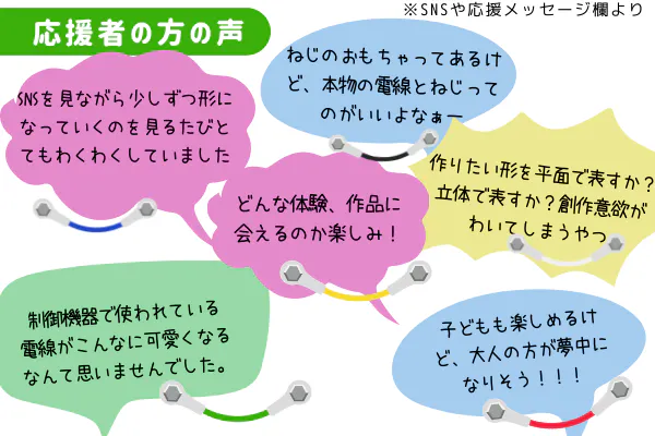 2022/06/30 11:38こんにちは!ケブラッチョのプロジェクトオーナー、五色電機 広報担当 おしんです。お気に入り登録いただき、ありがとうございます。いよいよ最終日になりました今日6/30(木)23:59で、いよいよこのプロジェクトが終了します。最初のプロジェクト開始のライブ配信でとても緊張して、終わってからコーラを何杯もおかわりしていた事は覚えていますが、そこから一ヶ月、何をしていたのか覚えていません。そのくらい、私なりに色んなことをやってきました。全てがちゃんと成果につながっているのか、無駄足だったのか、分かりません。特に、「私の知り合いでない人、私や五色電機を一切知らない人」に届けるのが特に難しかったです。ここは、プロジェクトをやる手前から、予算も使ってもっとテコ入れできる方法があったのは後から分かったりもしましたが、果たしてその予算が出せる状態だったのか、クラウドファンディング開始までそんなに時間を確保できたか?というと、NOに近い状態だったようにも思います。とにかく声に出す、行動してみる、でここまで来れましたケブラッチョがここに来るまで、色んな人を巻き込んで、助けていただいたり、応援いただいたりして、今の状態まで来ることができました。最初は私一人のアイデア、夢だったのですが、「こんなことしたい」「こんな人と話がしてみたい」「こんな所でやってみたい」を、無理そうでもいいから、ダメ元でとにかく声に出してみたら、色んな新しい繋がりやビジネスチャンスが生まれました。「やりたいけどどうせ無理だろうな」で自分の中で片付けていたら、ここまで来れませんでした。声に出すって、めちゃくちゃ大事なんだな、とこの1ヶ月や、ケブラッチョを思い付いた3月末からの3ヵ月間、本当に強く感じています。7月以降も、イベントの出店など、いくつか実現しそうなものがあります。また、ケブラッチョそのものではないですが、「子供達に学校などで仕事の話をできる場があったらやってみたい」ということも声に出していたら、学校とのご縁もいくつか生まれました。これについては、会社が無くなってしまったり活動拠点が変わることで、残念ながら継続は難しそうですが、それでも、今までただ制御盤をBtoB(企業対企業)のお仕事としてやっているだけだったら絶対に生まれなかったチャンスです。ケブラッチョ・配線アートやものづくりイベントを始め、色んな事をやってみて本当によかったと思っています。このプロジェクトの結果がどうであれ、みなさんの応援を胸に、ここから次のステップへ向けて頑張っていきたいと思います。達成しなかったらどうなるの?目標金額に届かなかったらどうなるのか?このご質問をよく頂きます。クラウドファンディングには、「All-In方式」と「All-or-Nothing方式 」があります。目標金額に届かなくても応援いただいた金額を受けとるのが「All-In方式」 、目標金額に届かなかったら返金する方式が「All-or-Nothing方式 」 です。例えばとあるプロジェクトをするのに1000万かかる、500万だけ集まってもできない、という場合は「All-or-Nothing方式 」 が適しています。私たちのプロジェクトは、「CAMPFIREというプラットフォーム(宣伝の場)を活用して先行販売を行うことで、より多くの人に広めながらスタートダッシュを切りたい」という内容でやっておりますので、「All-In方式」 を採用しております。CAMPFIRE様の手数料=広告費、という考え方で、宣伝しているイメージです。そのため、目標金額にいかなくても、応援購入いただいた金額(から手数料を引いたもの)を受け取り、リターン品の発送をさせていただきます。「なので、達成しなかったらどうなるの?」に対してのお答えは難しいのですが、「ケブラッチョのクラウドファンディングをやって、目標達成した(=人気がなかった?)/できなかった(=好評だった)」という実績が残るため、できればこれからの活動のために、よい結果を残したい、というのが答えです。本当は単純に合計金額やパーセンテージといった数字だけで語るのは嫌で、そこに支援してくださった一人一人の想いを大切にしたいですし、現時点でのべ100人もの方にご支援いただけただけで本当に胸がいっぱいなのですが、次へのステップを大きく、力強く踏み出していくために、ぜひあと少し、ご支援や他の方へこのプロジェクトを拡散いただけると幸いです。めちゃくちゃ暑くなってきたのに、こんな暑苦しい文章を最後までお読みいただきありがとうございました。アイスや塩分を補給して、熱中症には気を付けてくださいね! もっと見る