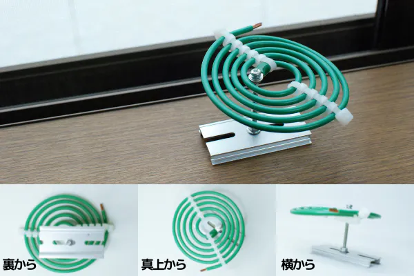 ご家庭でも、パソコンや大型家電のコンセントから緑のアース線が生えているのを見たことありませんか?アース=緑というルールがあるんです。そこで、緑の線を使ったアースな蚊取り線香(ただしアースは取れていない)、という、電気屋さんならクスっと笑ってしまう作品です。