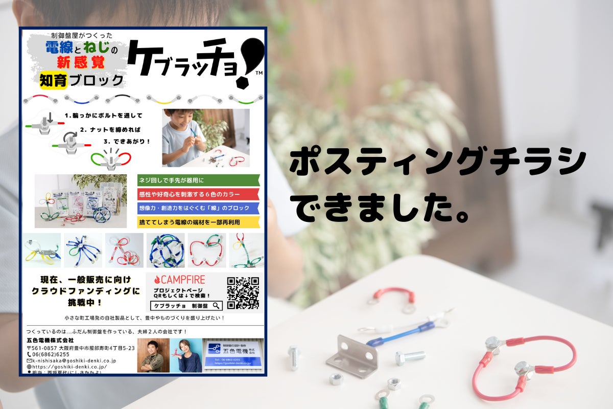おはようございます!『制御盤からやってきた!電線とネジの新感覚ブロック「ケブラッチョ」』のプロジェクトオーナー、五色電機 広報担当 おしんです。