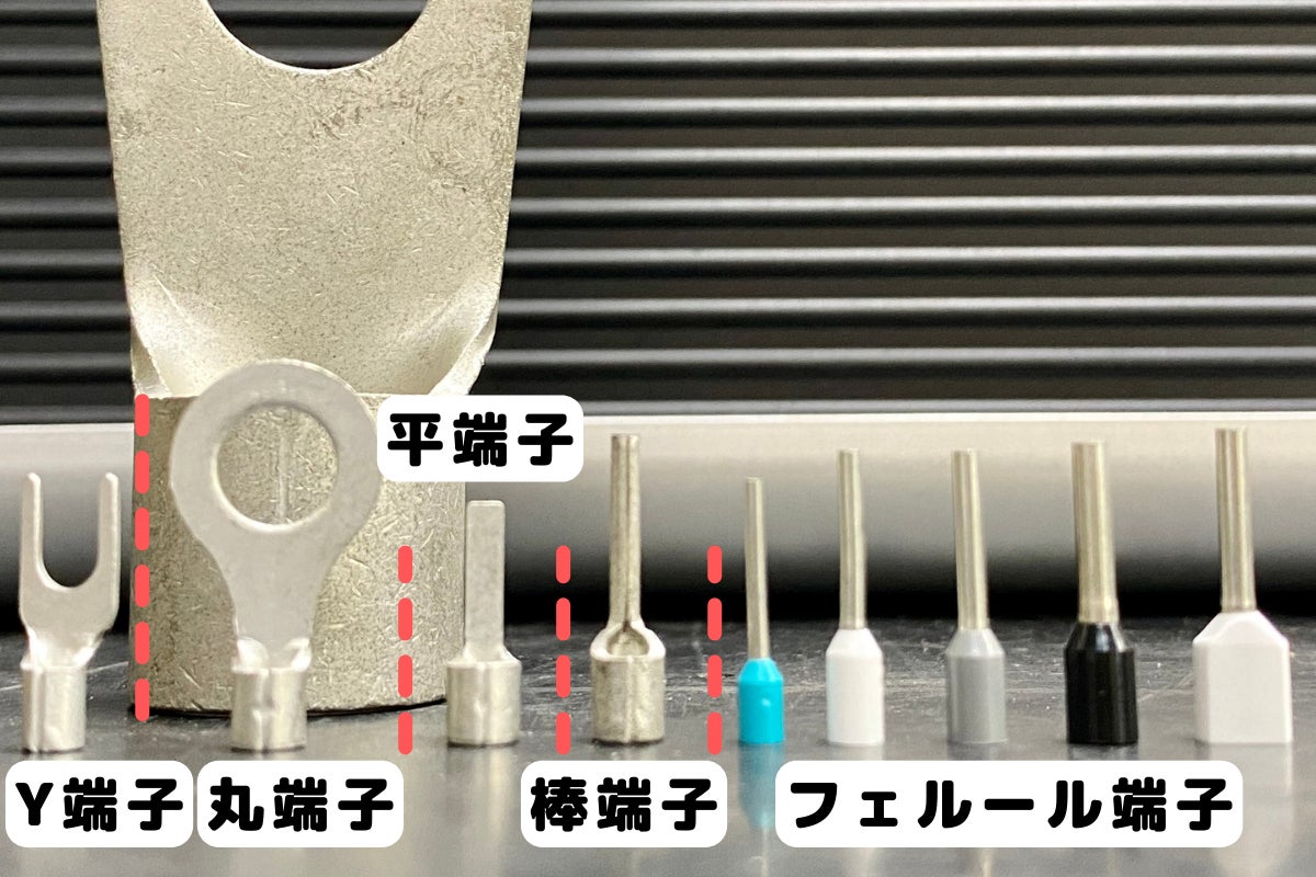 写真の右半分、棒端子と似ているけど、根本がカラフルで見た目にも楽しい端子は、「フェルール端子」と呼ばれています。端子は一般的に電線の太さに合わせてサイズを変えるのですが、このサイズ毎に色が変えられています。