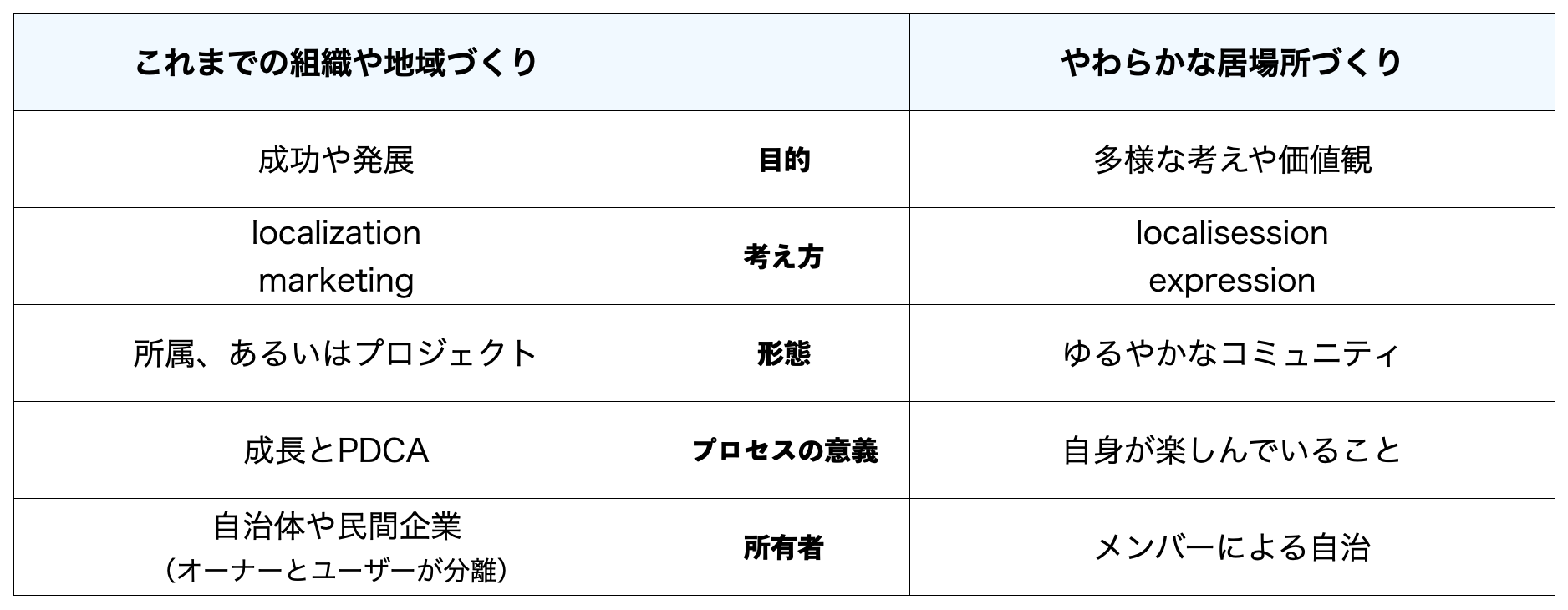 この1〜2年で急速にDXが社会に浸透し、物理的な距離や制約を超えた交流が増えました。人と人が集まるコミュニティもまた地理的な条件に囚われず、地域や所属をまたがって、オンライン/オンサイトと自由に居場所をつくれるようになりました。例えば地域芸術祭は、オンラインでの鑑賞やECでのグッズ販売、リモートでのボランティア・コミュニティなど、物理的な地域に囚われないコミュニケーションを生んでいます。”地域活性”も、その場所で行うことや住民に限らず、様々な場所で様々な人が自由にセッションを楽しむように交流しています。私たちはこういった開放的なコミュニティを「やわらかな居場所」とし、より深く考え、実践したいと思うようになりました。Localisessionの結成と今回の視察は、こういった思いを背景にしています。