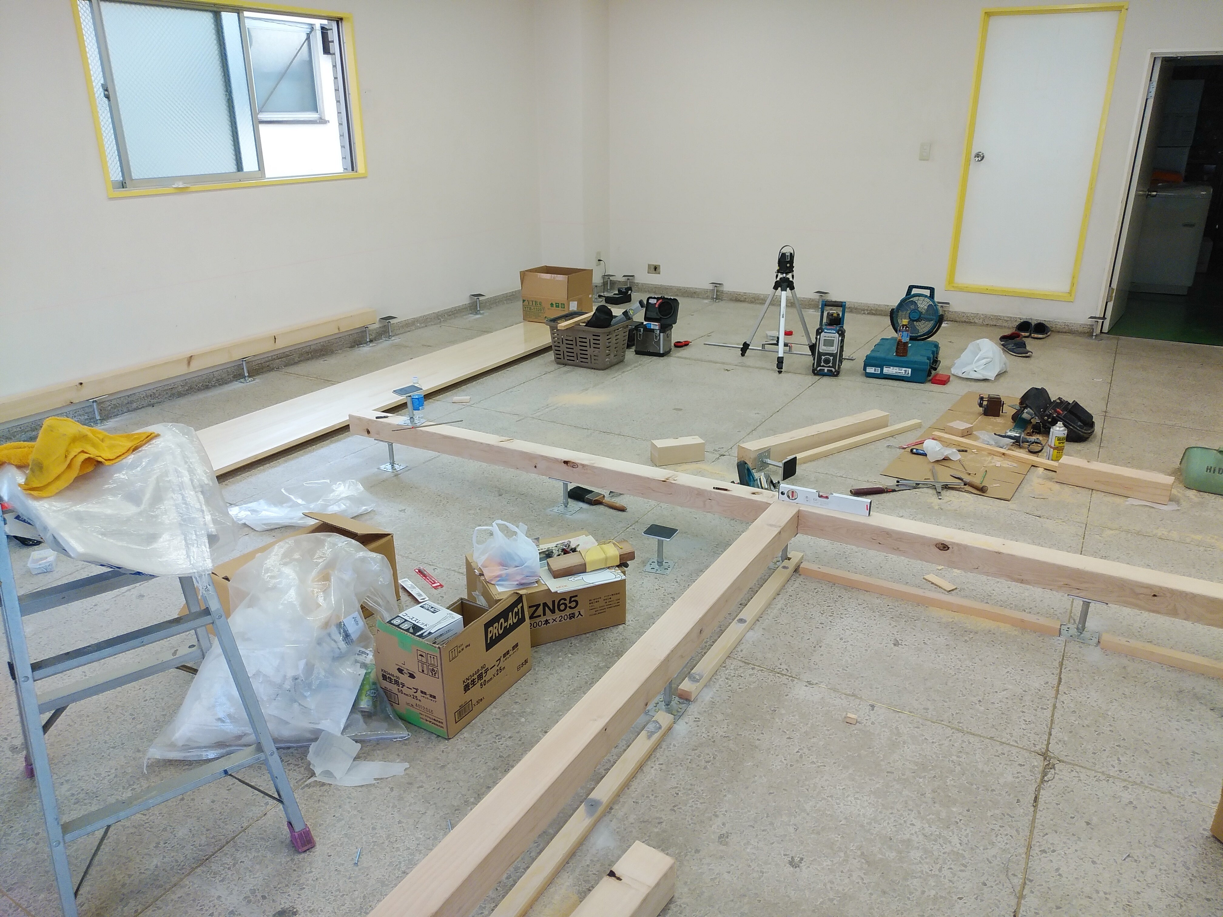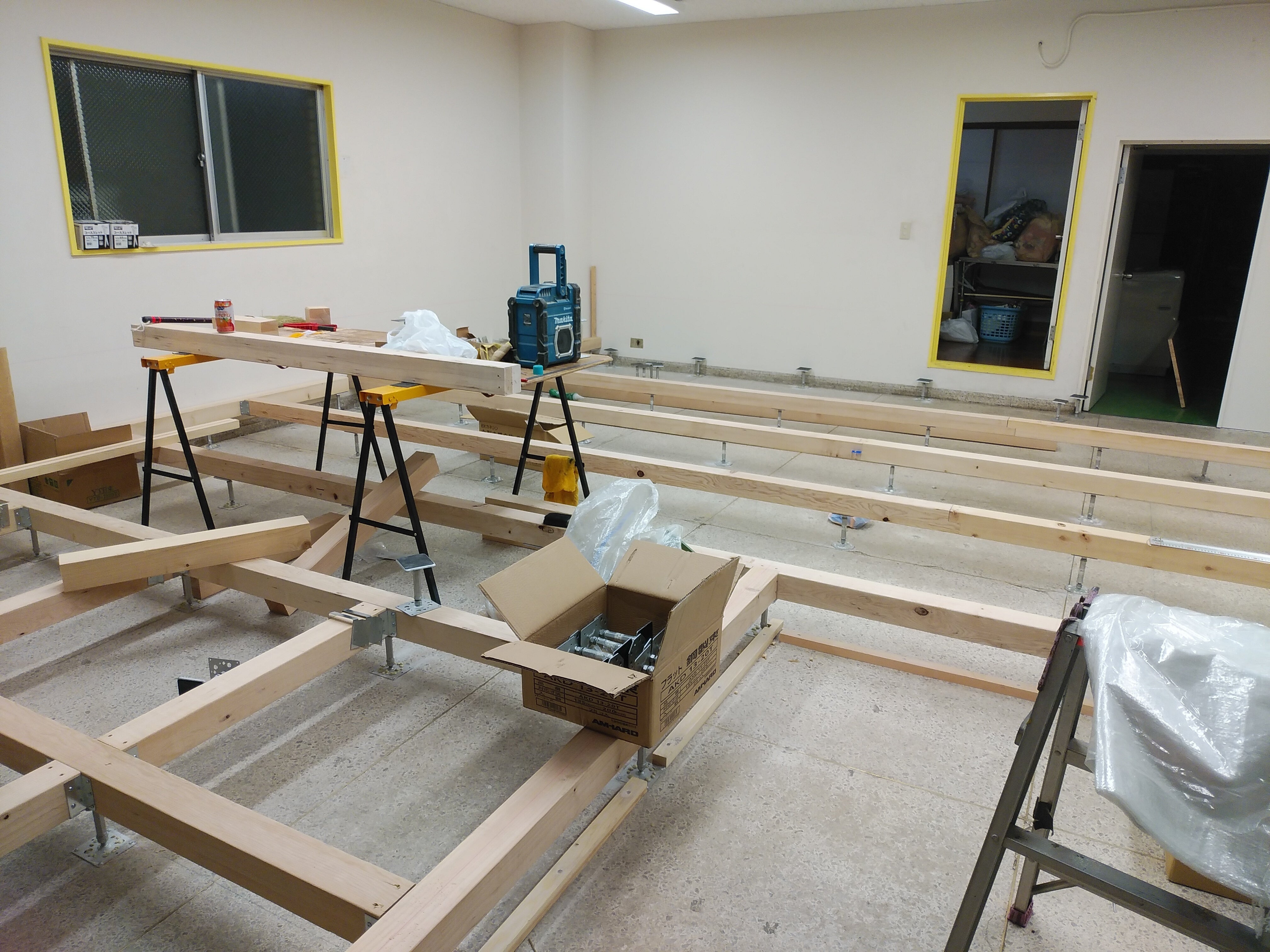 冷たいコンクリートの床には材木で骨組みし