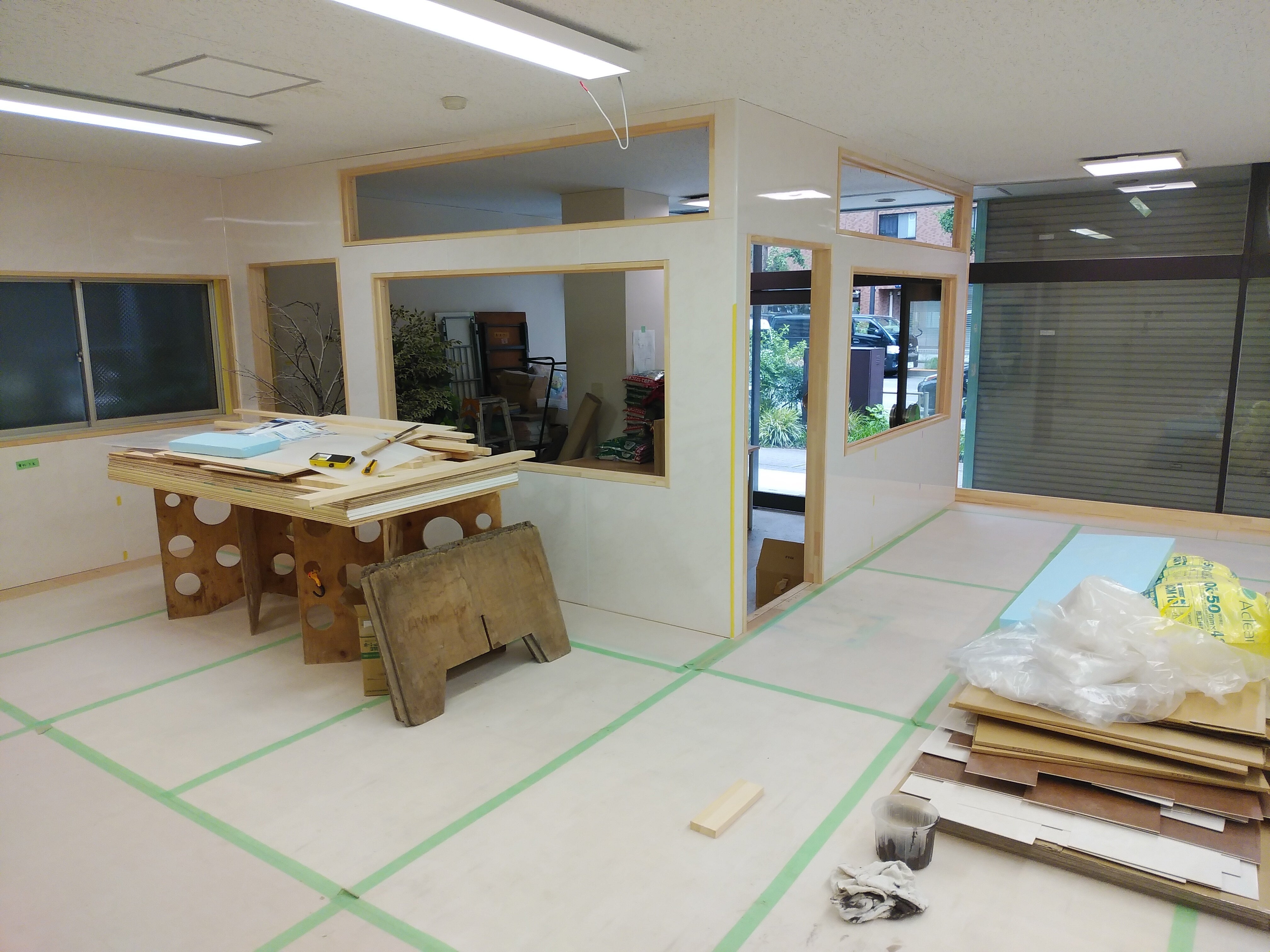 プロジェクト開始から20日が経過しました。目標に日々近づくことができ、皆様に大変感謝しております。今回は入り口の間仕切り工事の様子をご紹介いたします。店舗のドアは大きな両開きで、このドアだけでは人間の出入りの時に猫が外に出てしまいます。そこで、仕切り壁を作りドアから室内には引き戸を使って入ります。壁と同じように軽量鉄骨で枠組みを作ります。壁面すべてを板張りにしてしまうと、中の様子が見えないため腰から上は透明なアクリルボードを入れます。室内側はツルツル化粧板です。入り口側は壁紙です。入口の段差にはアルミスロープを用意して車いすの方でもご利用いただけるようにしたいと考えています。階段が苦手な方もお気軽に遊びにいらしていただけると嬉しいです。店舗入り口から仕切り壁に区切られた道路面から見える場所にレンタルボックスを設置する予定です。これで大工さんの大きなお仕事は終わり、次は内装屋さんの作業が始まります。子猫たちも順調に成長しています(=^・^=)5月半ばに保健所から引き取った4匹兄妹は、預かりさんのおうちですくすく成長して里親募集を開始しました。保護直後の4匹は猫風邪で少し目ヤニもが出ていました。今はこんなに大きくなりました。八王子市周辺で優しい里親さんを大募集中です。どうぞよろしくお願いいたします。