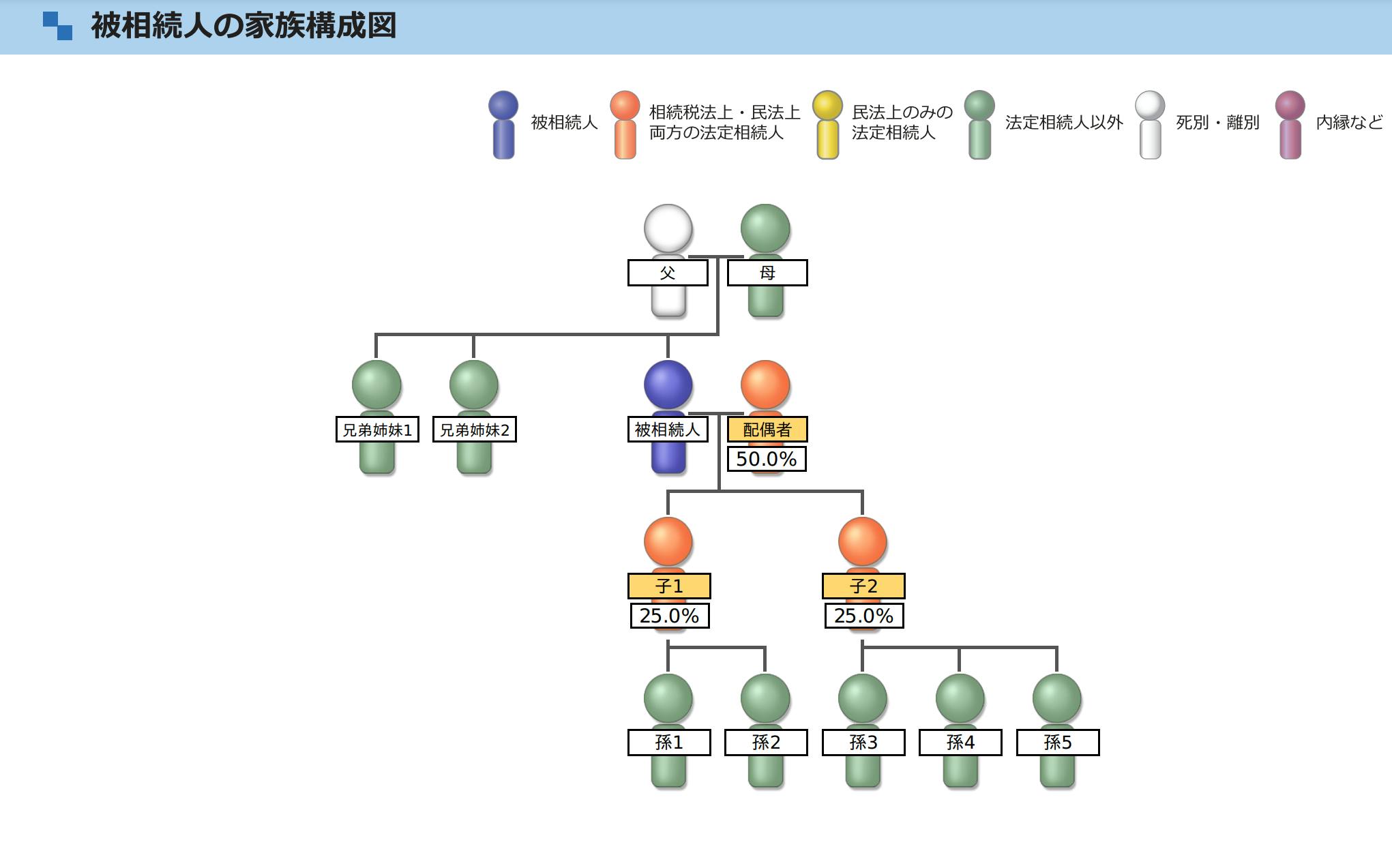 下図のように家族構成図が出来上がります。ここで法定相続人と法定相続分の確認ができます。