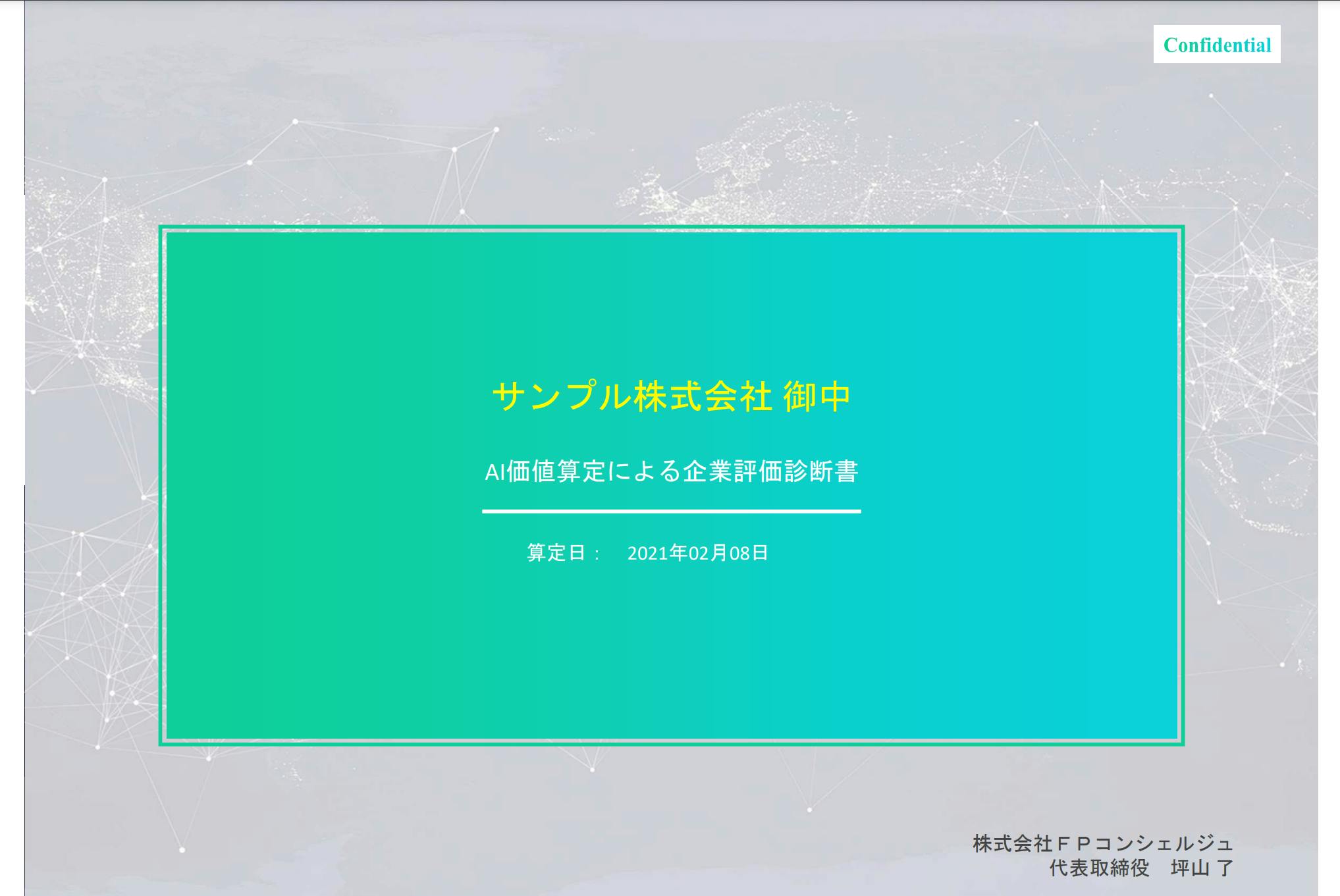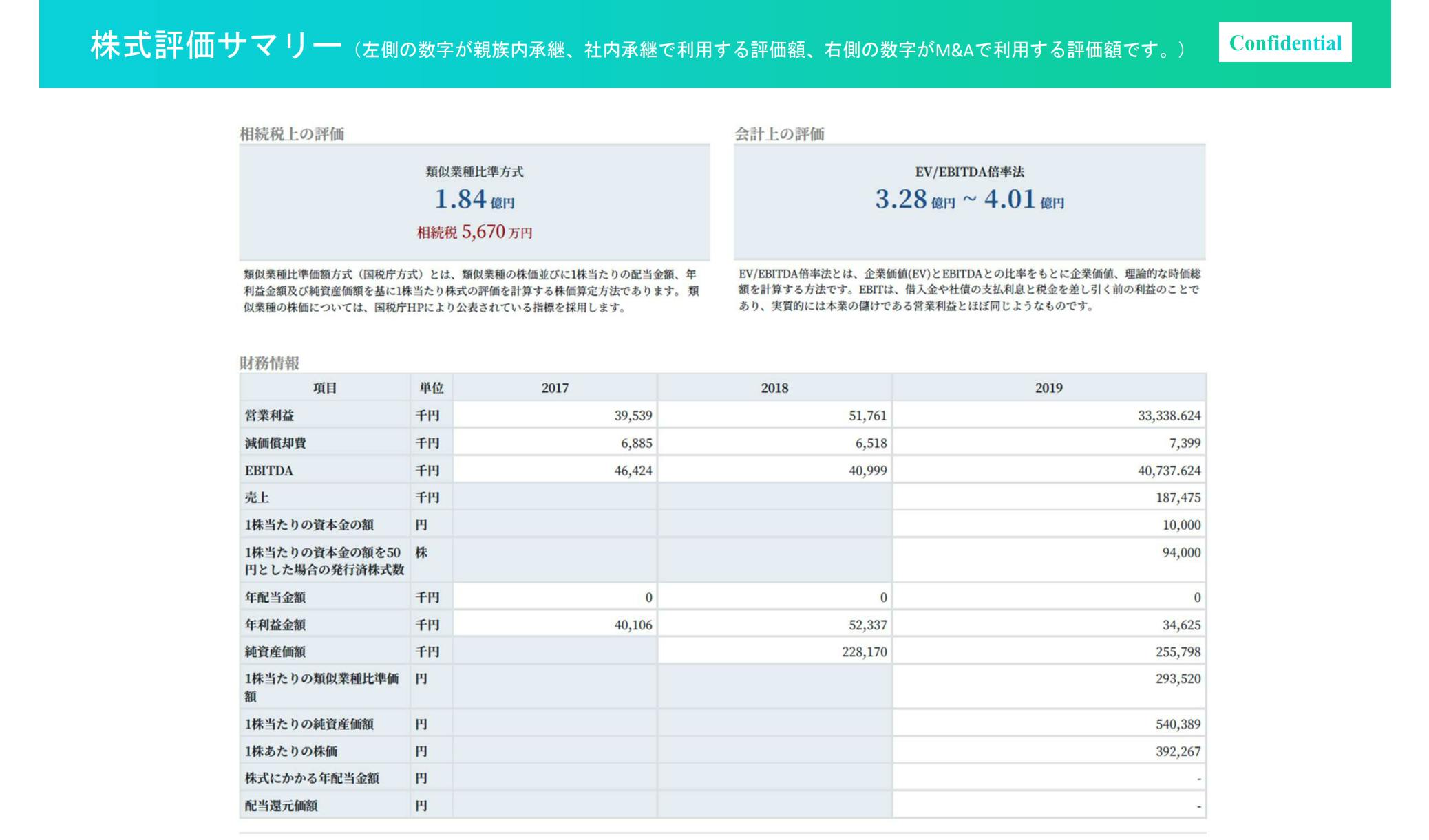 企業評価診断書では、相続税上と会計上の2つの評価額を同時に見ていただくことができます。親族内承継等自社株の贈与や相続を行う時に使うのが相続税上の評価額で、M&Aを行う時に使うのが会計上の評価額です。サンプルのように、両者の間に大きな金額の差が出るケースも多々あります。これら2つの評価額を知ることから経営者の出口対策への取り組みは始まります。