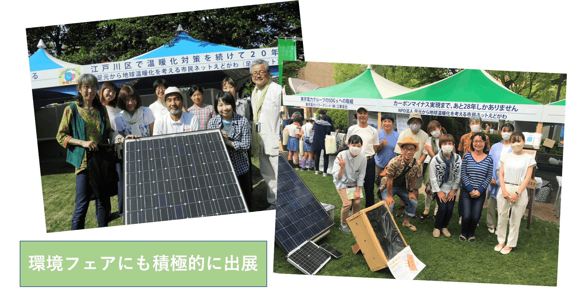 「NPO法人足元から地球温暖化を考える市民ネットえどがわ」は、1997年に気候変動枠組み条約第3回締約国会議が京都で開催されたのをきっかけに、江戸川区という地域で市民が主体的に地球温暖化=気候変動対策に取り組もうと、任意団体として設立されました。2001年にはNPO法人となり、会員は現在約120名です。