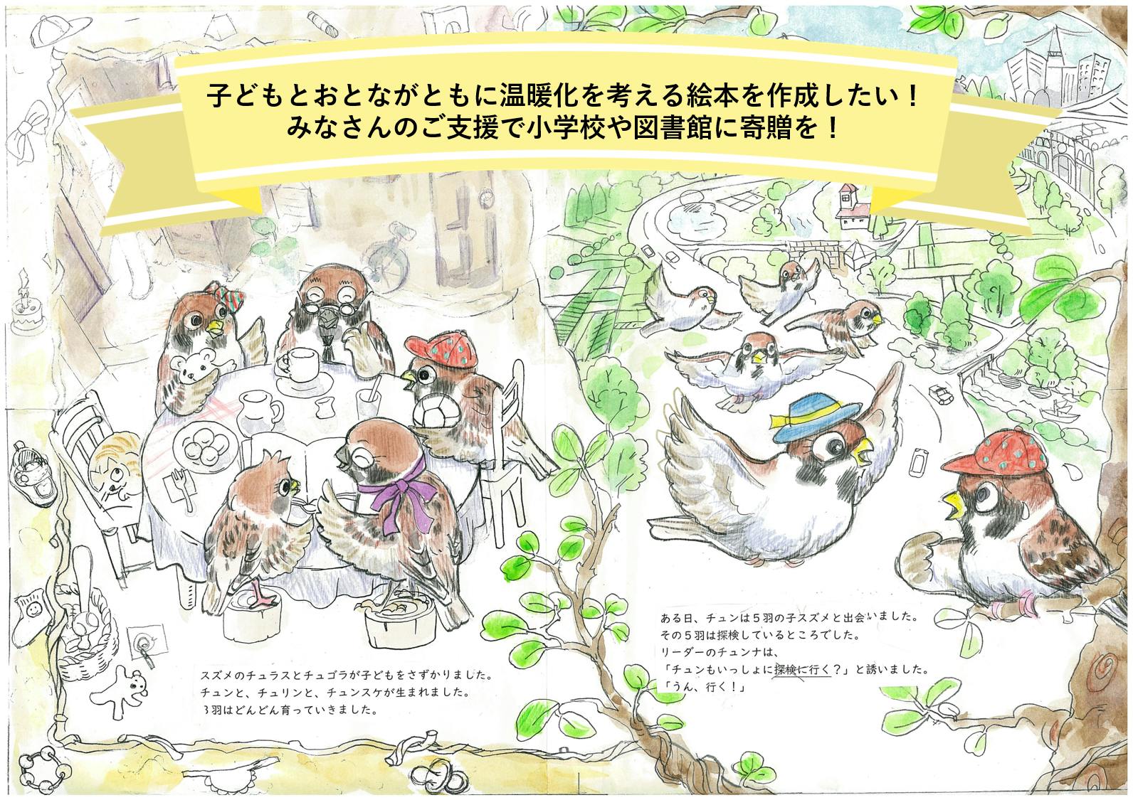 以前、彼女が小学校2年生の時に夏休みの宿題として作った絵本を見せてもらいました。それは主人公の子スズメが世界を救う印象的なファンタジーで、その世界観や登場する小鳥たちのかわいらしさにとても感銘を受けました。このお話を元に、新たな絵本作りを企画しました。たくさんの子どもたち、おとなたちに読んでいただきたいとの思いから、初めてクラウドファンディングで資金を集めることにしました。