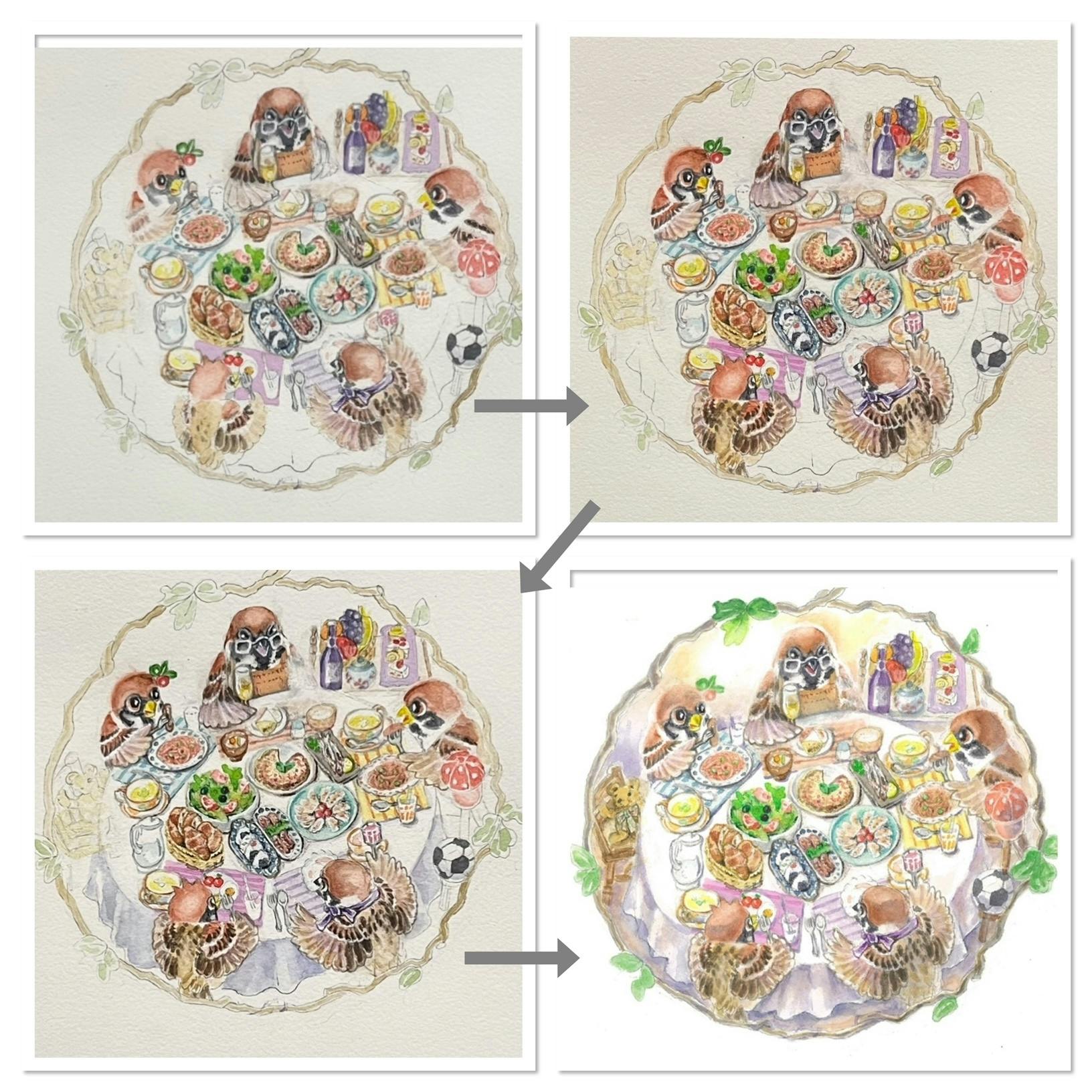 いよいよ、いよいよ、絵の仕上げ作業が大詰めを迎えております。 前回に引き続き、やまだかよこさんのお仕事の一部をここにご紹介しましょう。少しずつ丁寧に完成へと向かっていくのがわかります。作画の細やかさ、物語へのこだわりを感じていただけると思います。
