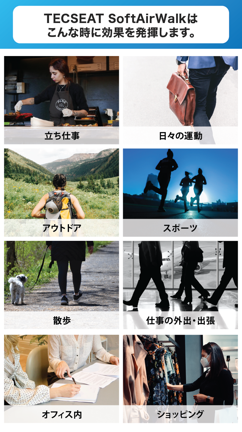 A) 立ち仕事から出張など外出、アウトドアやスポーツにもさまざまな場面で活躍します。