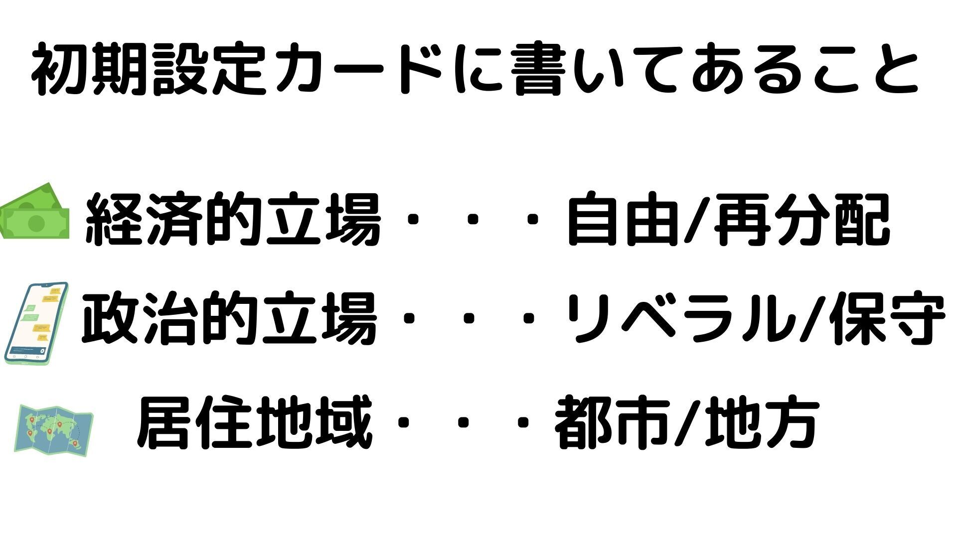 政治的欲求についてはゲームの始めに初期設定カードが配られ、自分がどのような政治的立場の市民なのかという設定が決められます。