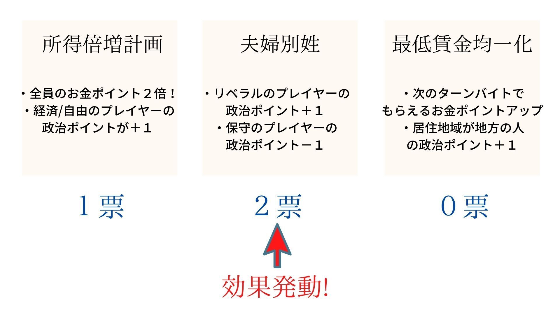 プレイヤーは政策を確認した後、「投票」か「バイト」どちらかの行動を選ぶことが出来ます。