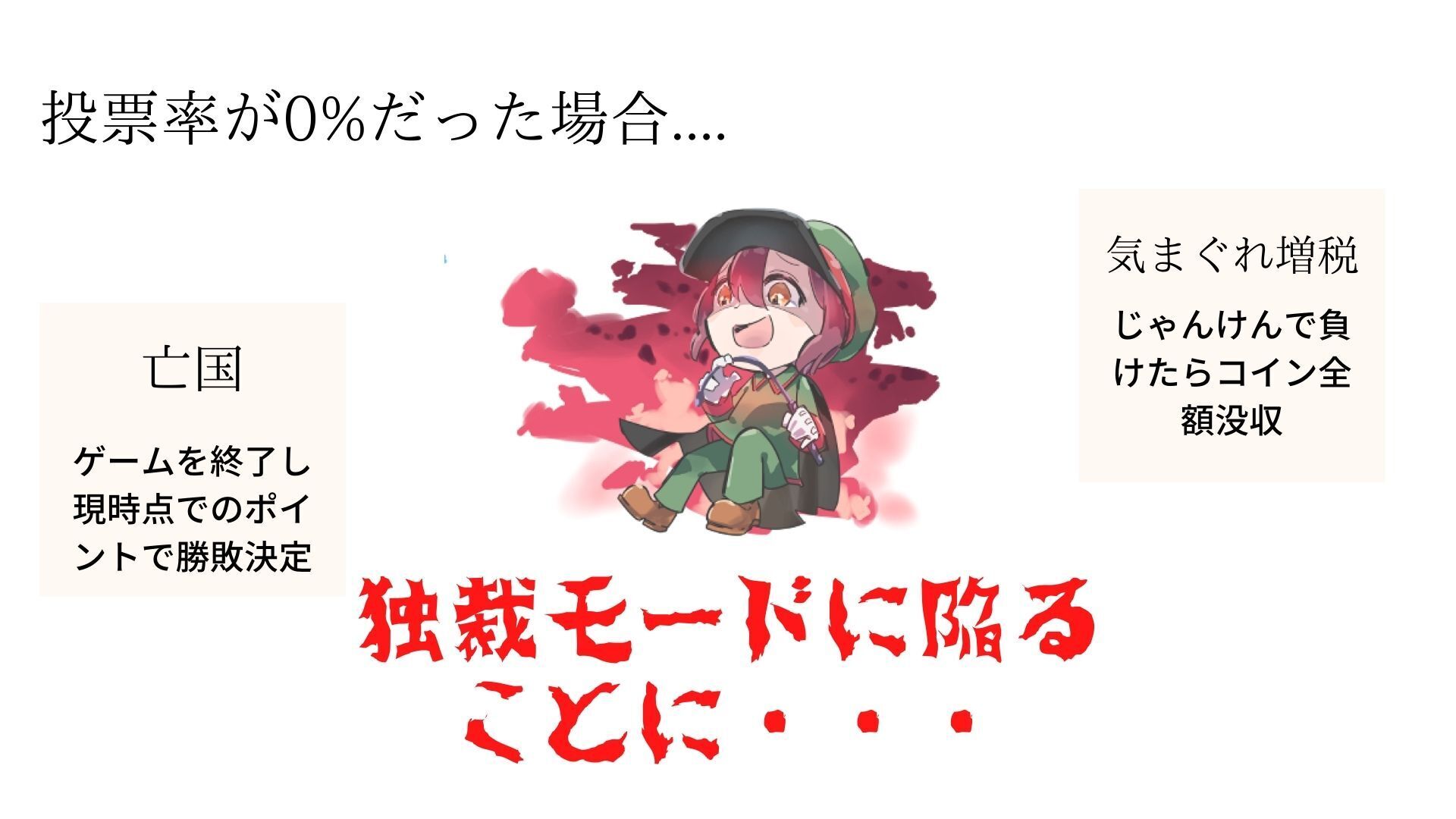 ただし!もしプレイヤー全員が投票に行かなかった場合(プレイヤー全員がバイトを選択=投票率が0%だった場合)、民主主義を放棄したとみなされ、ゲームの世界は独裁に陥ってしまいます!
