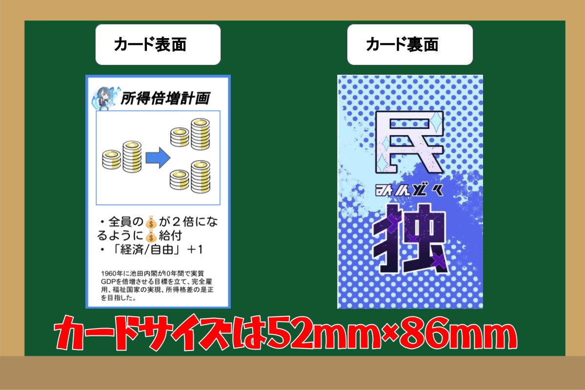 政策カードはどれも現実に行われた政策を基にしており、また各政策カードの下にはその政策がどのような目的を持って行われてどのような結果をもたらしたのかということについて簡単な解説がついています。さらに重要政策については解説動画を作成し、QRコードを掲載予定です。