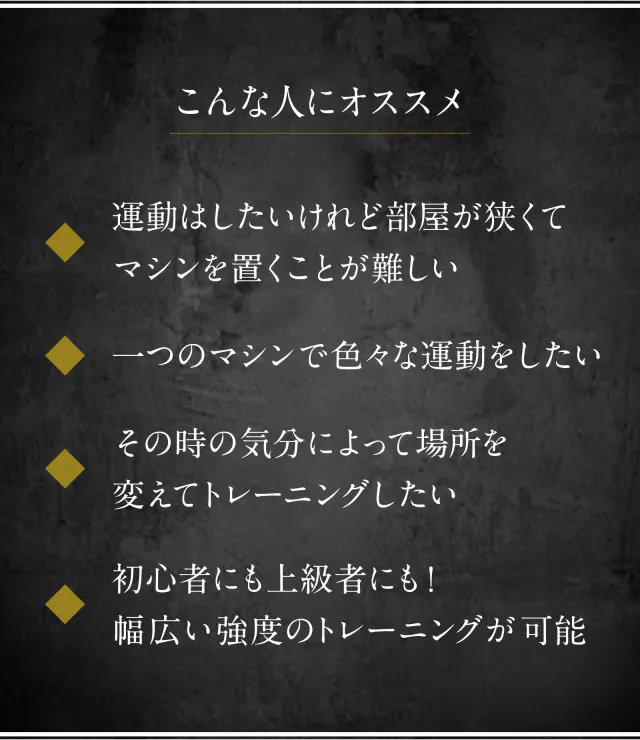 もうジムに行かなくても大丈夫! ご自宅のちょっとしたスペースでサッと組み立てができるトレーニングマシンの登場です!