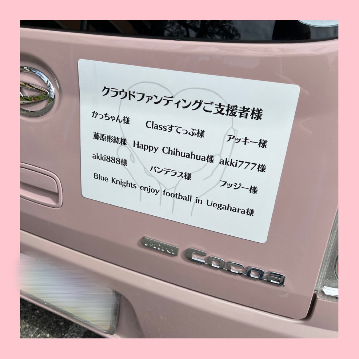 皆様のおかげで、訪問用車体の購入と、車体へのお名前プリントのリターンを遂行しましたので