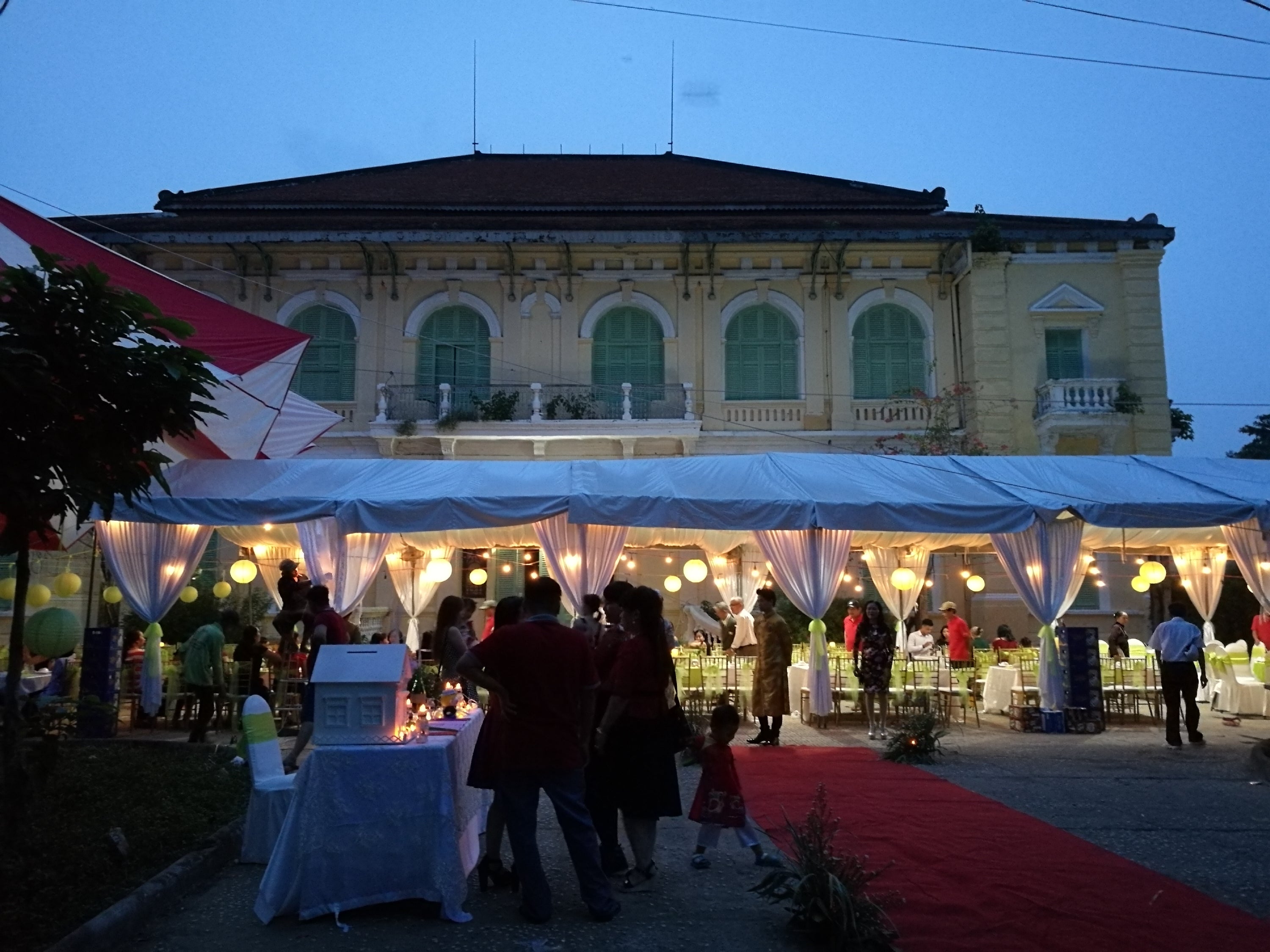 結婚式場に着くとたくさんの人達。ベトナムでも女性ゲストはドレスを着ていて、アオザイを着ている私は目立っていたのか、「似合っているよ」っていろんな方に褒められました。