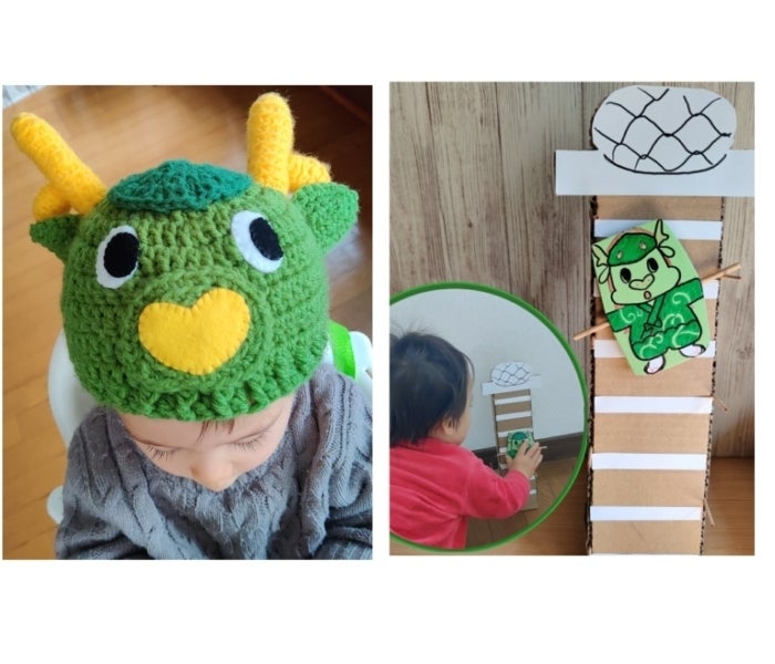 写真の左、まいりゅうの帽子は私の母が作ってくれました。中央図書館に行き、子ども用の編み物の帽子を手作りする本が目立つところにあり、見ていると干支のページがでてきて龍の帽子が!